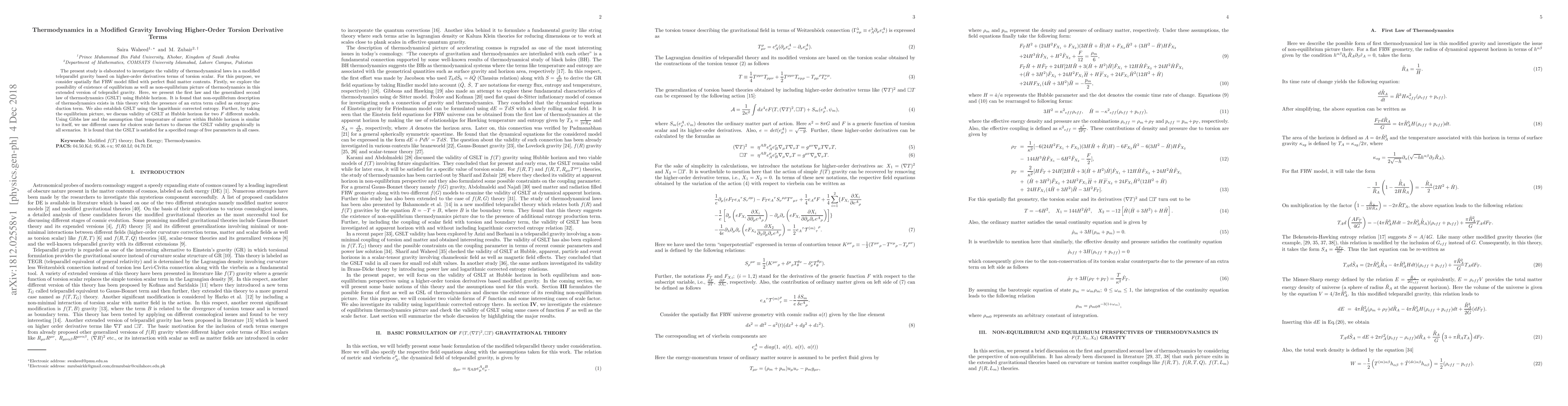 The present study is elaborated to investigate the validity of thermodynamical laws in a modified teleparallel gravity based on higher-order derivatives terms of torsion scalar. For this purpose, we consider spatially flat FRW model filled with perfect fluid matter contents. Firstly, we explore the possibility of existence of equilibrium as well as non-equilibrium picture of thermodynamics in this extended version of teleprallel gravity. Here, we present the first law and the generalized second law of thermodynamics (GSLT) using Hubble horizon. It is found that non-equilibrium description of thermodynamics exists in this theory with the presence of an extra term called as entropy production term. We also establish GSLT using the logarithmic corrected entropy. Further, by taking the equilibrium picture, we discuss validity of GSLT at Hubble horizon for two $F$ different models. Using Gibbs law and the assumption that temperature of matter within Hubble horizon is similar to itself, we use different cases for choices scale factors to discuss the GSLT validity graphically in all scenarios. It is found that the GSLT is satisfied for a specified range of free parameters in all cases.