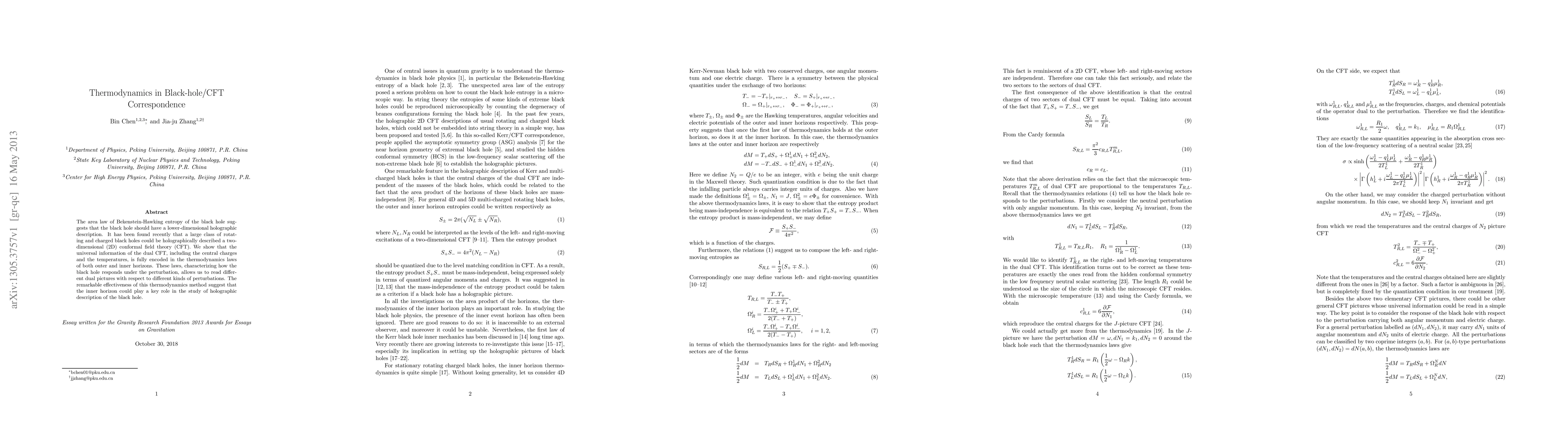 This paper explores the thermodynamics of black holes and demonstrates that their Bekenstein-Hawking entropy supports a holographic description via a two-dimensional conformal field theory. It reveals that universal information in the dual CFT, including central charges and temperatures, is encoded in the thermodynamic laws of both the outer and inner horizons, suggesting the inner horizon's crucial role in the black hole's holographic description.