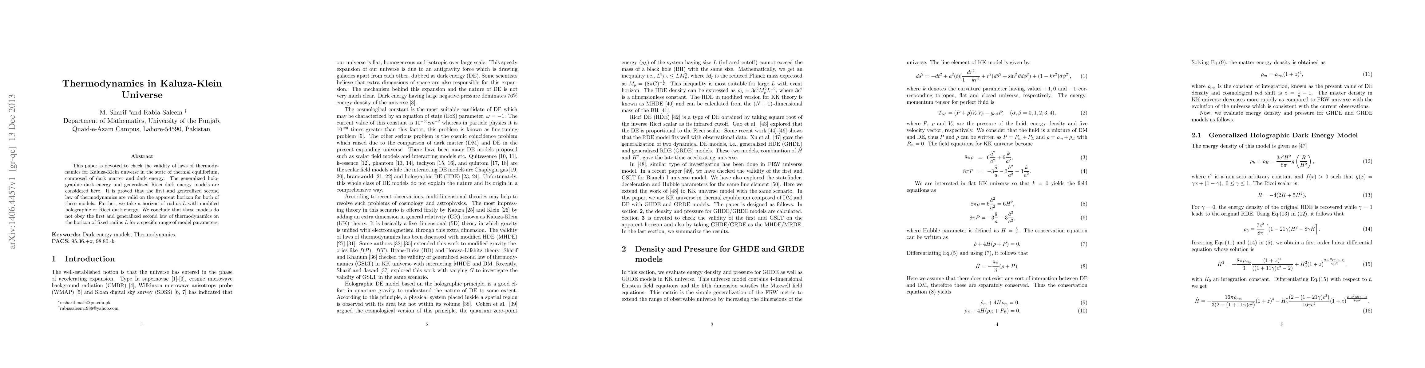 This research paper examines the validity of thermodynamic laws in a Kaluza-Klein universe composed of dark matter and dark energy. It proves that the first and generalized second law of thermodynamics hold for generalized holographic and Ricci dark energy models on the apparent horizon. However, these laws may not be obeyed on a horizon of fixed radius L for certain model parameters.