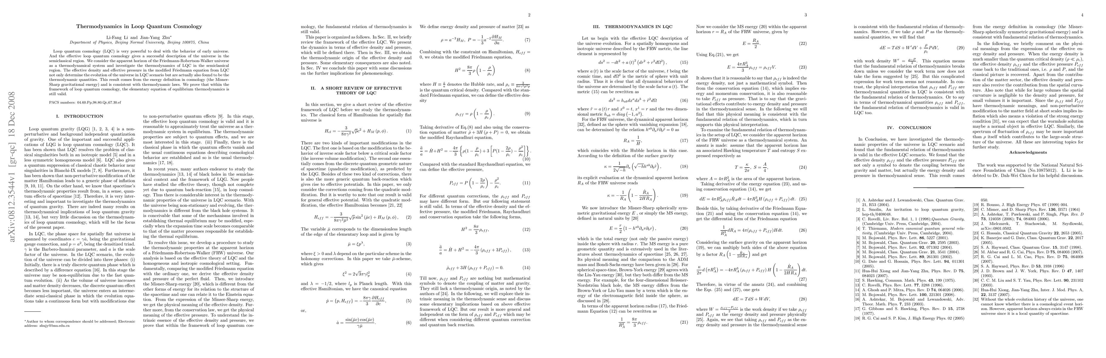 This paper explores the thermodynamics of loop quantum cosmology (LQC) by treating the apparent horizon of the Friedmann-Robertson-Walker universe as a thermodynamical system. It finds that effective density and pressure in the modified Friedmann equation from LQC correspond to thermodynamic quantities, consistent with thermodynamic laws.