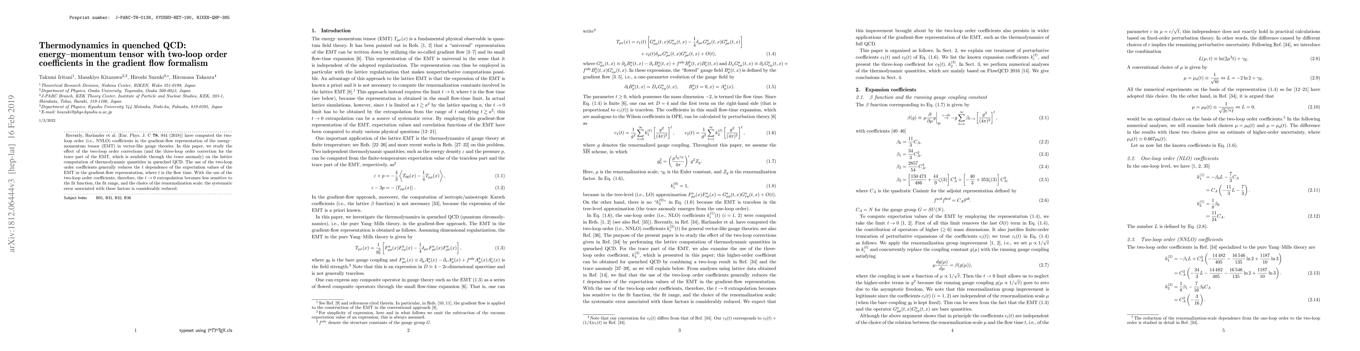 This paper investigates the impact of two-loop order corrections in the gradient flow formalism on lattice computations of thermodynamic quantities in quenched QCD. The inclusion of these corrections reduces the $t$-dependence of the energy-momentum tensor, thereby minimizing systematic errors in the $t\to0$ extrapolation.