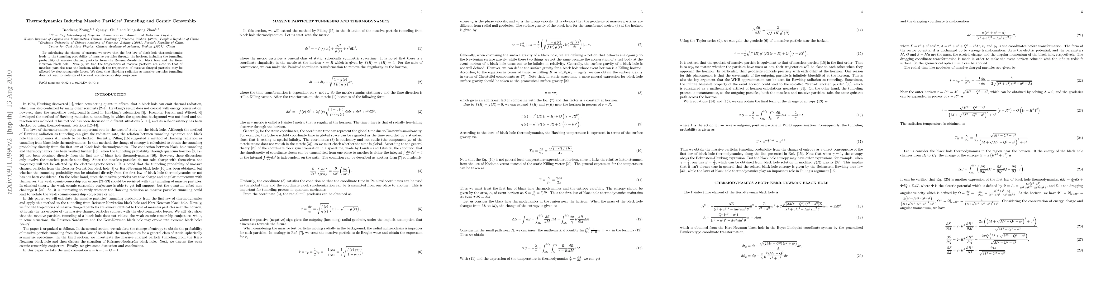 By calculating the change of entropy, we prove that the first law of black hole thermodynamics leads to the tunneling probability of massive particles through the horizon, including the tunneling probability of massive charged particles from the Reissner-Nordstr\"om black hole and the Kerr-Newman black hole. Novelly, we find the trajectories of massive particles are close to that of massless particles near the horizon, although the trajectories of massive charged particles may be affected by electromagnetic forces. We show that Hawking radiation as massive particles tunneling does not lead to violation of the weak cosmic-censorship conjecture.