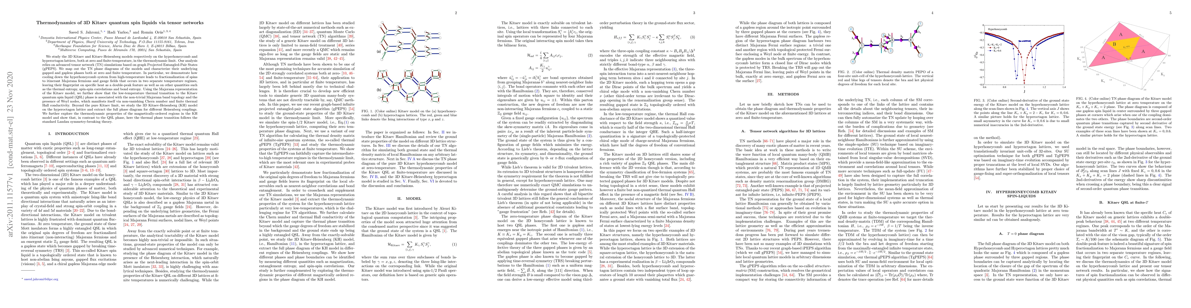 We study the 3D Kitaev and Kitaev-Heisenberg models respectively on the hyperhoneycomb and hyperoctagon lattices, both at zero and finite-temperature, in the thermodynamic limit. Our analysis relies on advanced tensor network (TN) simulations based on graph Projected Entangled-Pair States (gPEPS). We map out the TN phase diagrams of the models and characterize their underlying gapped and gapless phases both at zero and finite temperature. In particular, we demonstrate how cooling down the hyperhoneycomb system from high-temperature leads to fractionalization of spins to itinerant Majorana fermions and gauge fields that occurs in two separate temperature regimes, leaving their fingerprint on specific heat as a double-peak feature as well as on other quantities such as the thermal entropy, spin-spin correlations and bond entropy. Using the Majorana representation of the Kitaev model, we further show that the low-temperature thermal transition to the Kitaev quantum spin liquid (QSL) phase is associated with the non-trivial Majorana band topology and the presence of Weyl nodes, which manifests itself via non-vanishing Chern number and finite thermal Hall conductivity. Beyond the pure Kitaev limit, we study the 3D Kitaev-Heisenberg (KH) model on the hyperoctagon lattice and extract the full phase diagram for different Heisenberg couplings. We further explore the thermodynamic properties of the magnetically-ordered regions in the KH model and show that, in contrast to the QSL phase, here the thermal phase transition follows the standard Landau symmetry-breaking theory.