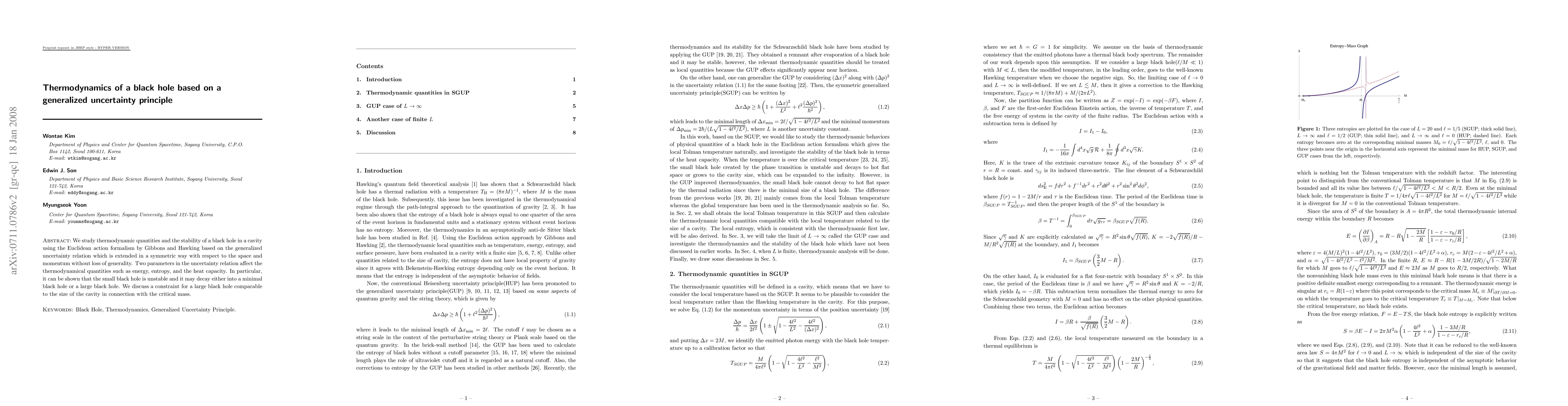 We study thermodynamic quantities and the stability of a black hole in a cavity using the Euclidean action formalism by Gibbons and Hawking based on the generalized uncertainty relation which is extended in a symmetric way with respect to the space and momentum without loss of generality. Two parameters in the uncertainty relation affect the thermodynamical quantities such as energy, entropy, and the heat capacity. In particular, it can be shown that the small black hole is unstable and it may decay either into a minimal black hole or a large black hole. We discuss a constraint for a large black hole comparable to the size of the cavity in connection with the critical mass.