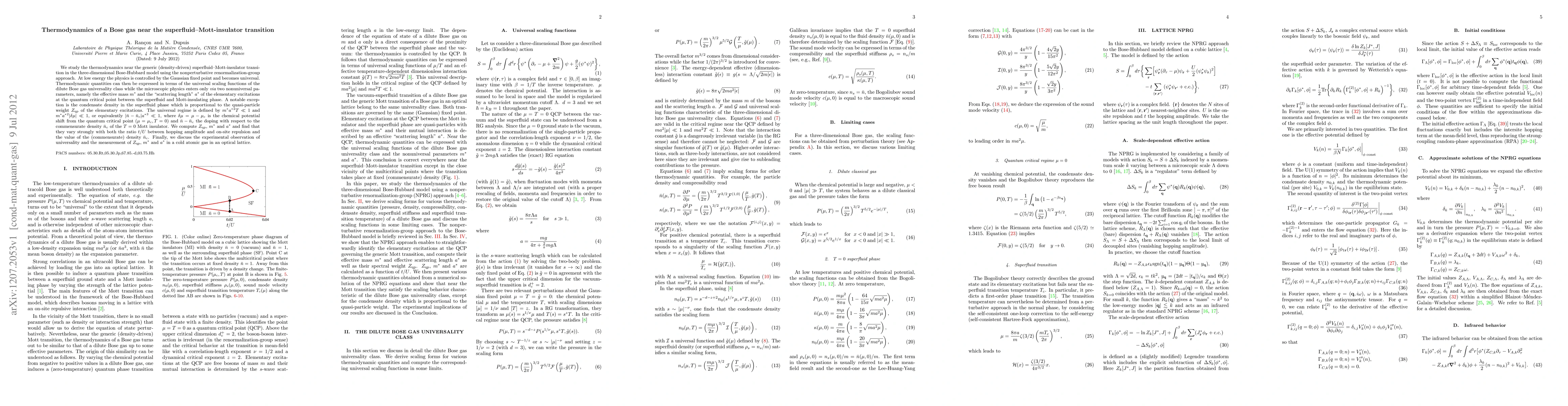 We study the thermodynamics near the generic (density-driven) superfluid--Mott-insulator transition in the three-dimensional Bose-Hubbard model using the nonperturbative renormalization-group approach. At low energy the physics is controlled by the Gaussian fixed point and becomes universal. Thermodynamic quantities can then be expressed in terms of the universal scaling functions of the dilute Bose gas universality class while the microscopic physics enters only {\it via} two nonuniversal parameters, namely the effective mass $m^*$ and the "scattering length" $a^*$ of the elementary excitations at the quantum critical point between the superfluid and Mott-insulating phase. A notable exception is the condensate density in the superfluid phase which is proportional to the quasi-particle weight $\Zqp$ of the elementary excitations. The universal regime is defined by $m^*a^*{}^2 T\ll 1$ and $m^*a^*{}^2|\delta\mu|\ll 1$, or equivalently $|\bar n-\bar n_c|a^*{}^3\ll 1$, where $\delta\mu=\mu-\mu_c$ is the chemical potential shift from the quantum critical point $(\mu=\mu_c,T=0)$ and $\bar n-\bar n_c$ the doping with respect to the commensurate density $\bar n_c$ of the T=0 Mott insulator. We compute $\Zqp$, $m^*$ and $a^*$ and find that they vary strongly with both the ratio $t/U$ between hopping amplitude and on-site repulsion and the value of the (commensurate) density $\bar n_c$. Finally, we discuss the experimental observation of universality and the measurement of $\Zqp$, $m^*$ and $a^*$ in a cold atomic gas in an optical lattice.