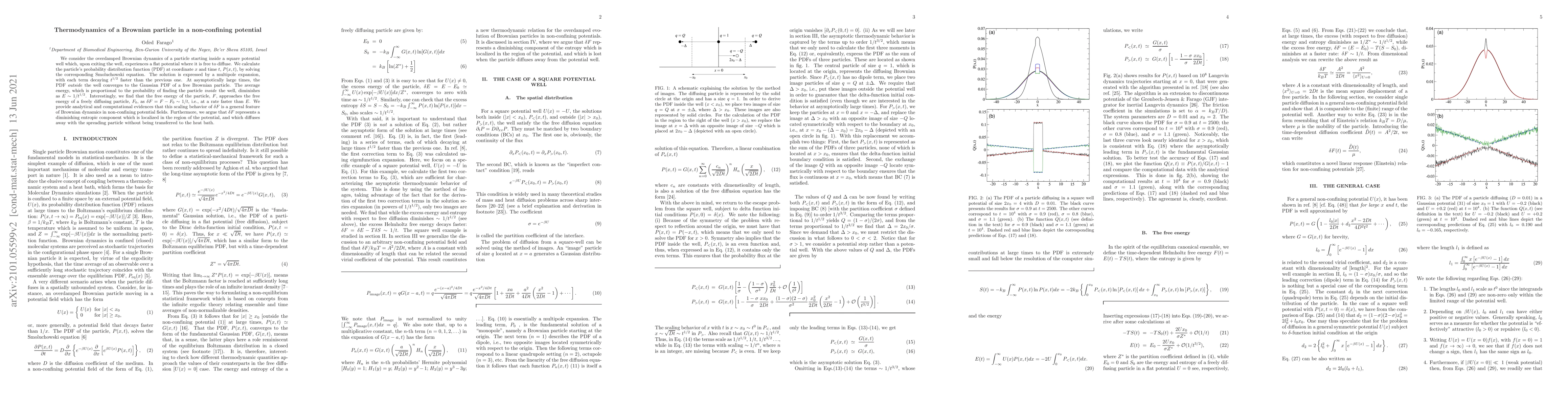 We consider the overdamped Brownian dynamics of a particle starting inside a square potential well which, upon exiting the well, experiences a flat potential where it is free to diffuse. We calculate the particle's probability distribution function (PDF) at coordinate $x$ and time $t$, $P(x,t)$, by solving the corresponding Smoluchowski equation. The solution is expressed by a multipole expansion, with each term decaying $t^{1/2}$ faster than the previous one. At asymptotically large times, the PDF outside the well converges to the Gaussian PDF of a free Brownian particle. The average energy, which is proportional to the probability of finding the particle inside the well, diminishes as $E\sim 1/t^{1/2}$. Interestingly, we find that the free energy of the particle, $F$, approaches the free energy of a freely diffusing particle, $F_0$, as $\delta F=F-F_0\sim 1/t$, i.e., at a rate faster than $E$. We provide analytical and computational evidences that this scaling behavior of $\delta F$ is a general feature of Brownian dynamics in non-confining potential fields. Furthermore, we argue that $\delta F$ represents a diminishing entropic component which is localized in the region of the potential, and which diffuses away with the spreading particle without being transferred to the heat bath.
