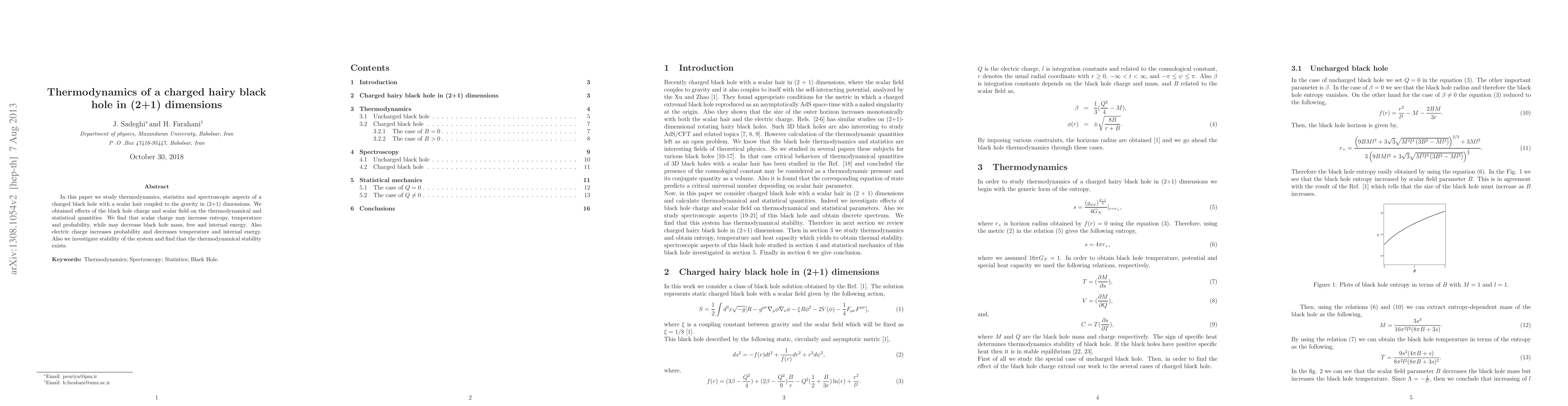 In this paper we study thermodynamics, statistics and spectroscopic aspects of a charged black hole with a scalar hair coupled to the gravity in (2+1) dimensions. We obtained effects of the black hole charge and scalar field on the thermodynamical and statistical quantities. We find that scalar charge may increase entropy, temperature and probability, while may decrease black hole mass, free and internal energy. Also electric charge increases probability and decreases temperature and internal energy. Also we investigate stability of the system and find that the thermodynamical stability exists.