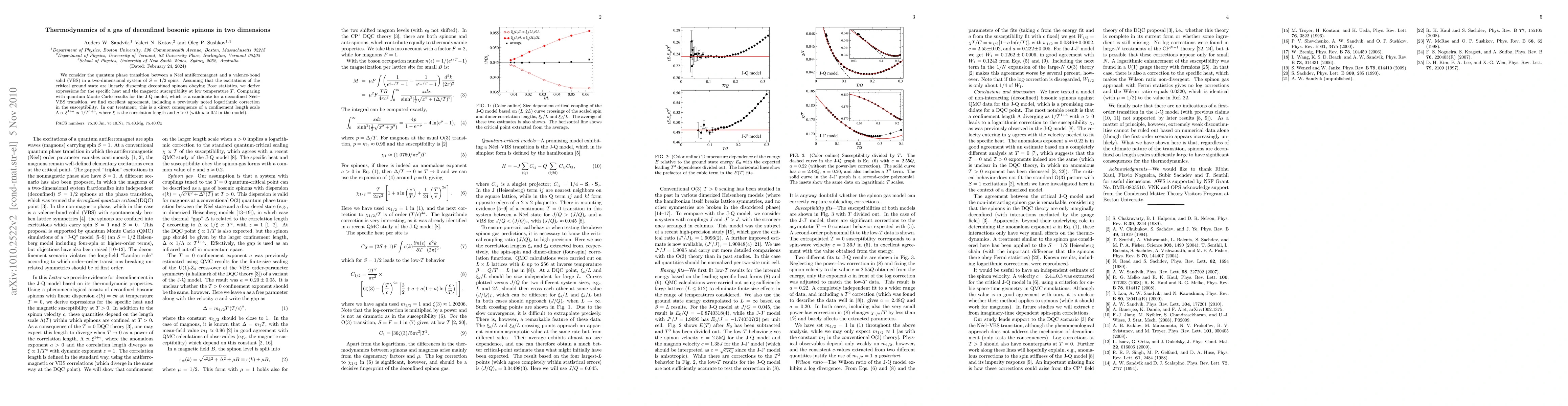 This paper investigates the thermodynamics of a quantum phase transition between Neel antiferromagnetism and a valence-bond solid in a two-dimensional spin system, deriving expressions for specific heat and magnetic susceptibility that match quantum Monte Carlo results for the J-Q model, highlighting a logarithmic correction linked to a confinement length scale.