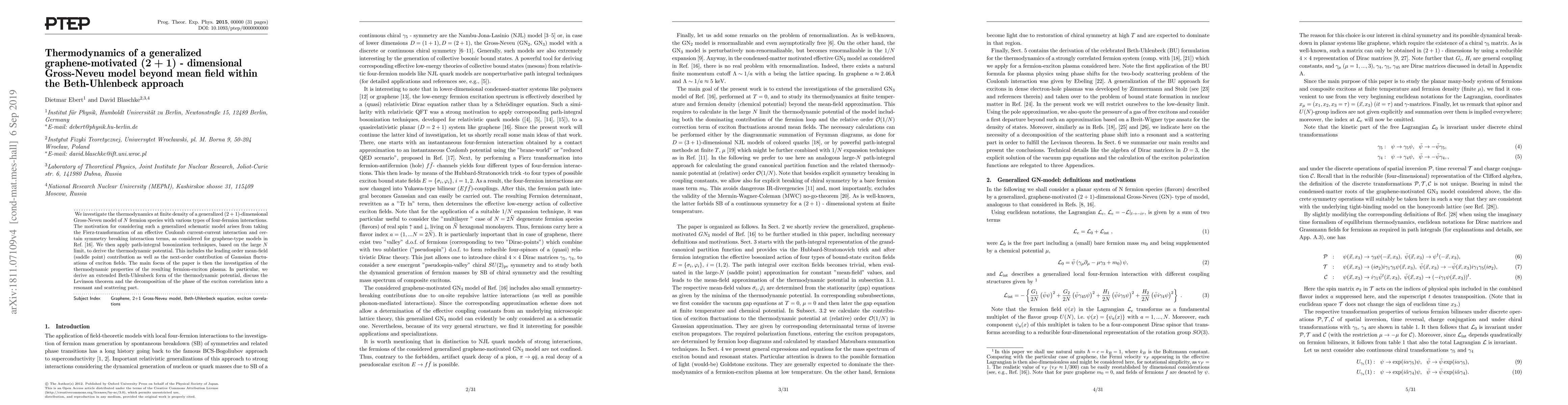We investigate the thermodynamics at finite density of a generalized $(2 + 1)$-dimensional Gross-Neveu model of $N$ fermion species with various types of four-fermion interactions. The motivation for considering such a generalized schematic model arises from taking the Fierz-transformation of an effective Coulomb current-current interaction and certain symmetry breaking interaction terms, as considered for graphene-type models in Ref. [16]. We then apply path-integral bosonization techniques, based on the large $N$ limit, to derive the thermodynamic potential. This includes the leading order mean-field (saddle point) contribution as well as the next-order contribution of Gaussian fluctuations of exciton fields. The main focus of the paper is then the investigation of the thermodynamic properties of the resulting fermion-exciton plasma. In particular, we derive an extended Beth-Uhlenbeck form of the thermodynamic potential, discuss the Levinson theorem and the decomposition of the phase of the exciton correlation into a resonant and scattering part.