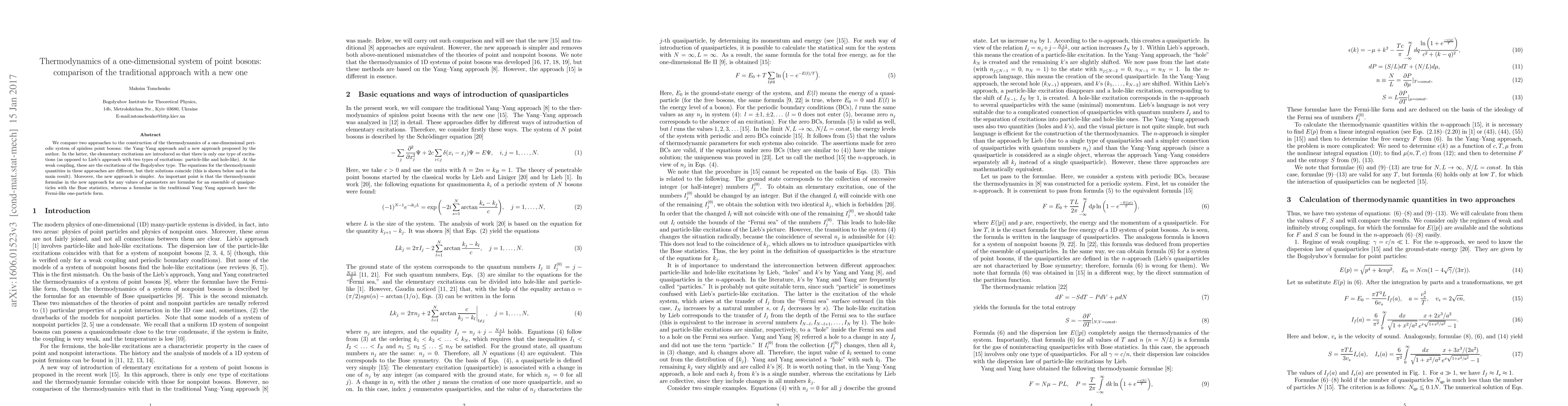 This paper compares two methods for constructing the thermodynamics of a one-dimensional system of spinless point bosons: the traditional Yang-Yang approach and a new method proposed by the author. The new approach simplifies the system by introducing only one type of elementary excitation, leading to thermodynamic formulae for an ensemble of quasiparticles with Bose statistics.