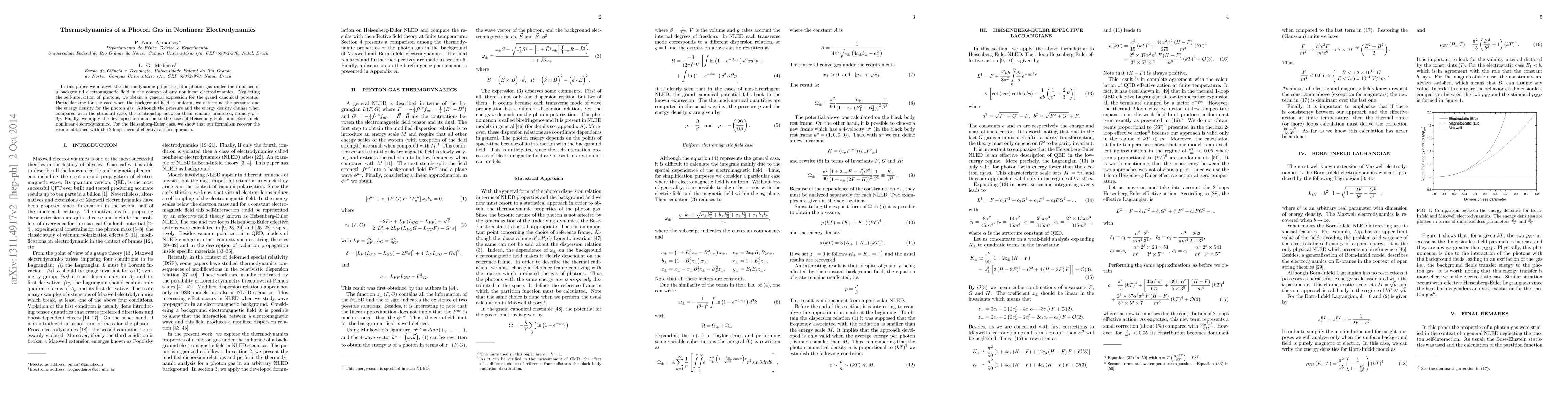 This paper investigates the thermodynamics of a photon gas influenced by a background electromagnetic field in nonlinear electrodynamics, deriving a general expression for the grand canonical potential. It finds that while the pressure and energy density differ from the standard case, their ratio remains $\rho=3p$, and applies the results to the Heisenberg-Euler and Born-Infeld models, validating the formalism with known results.
