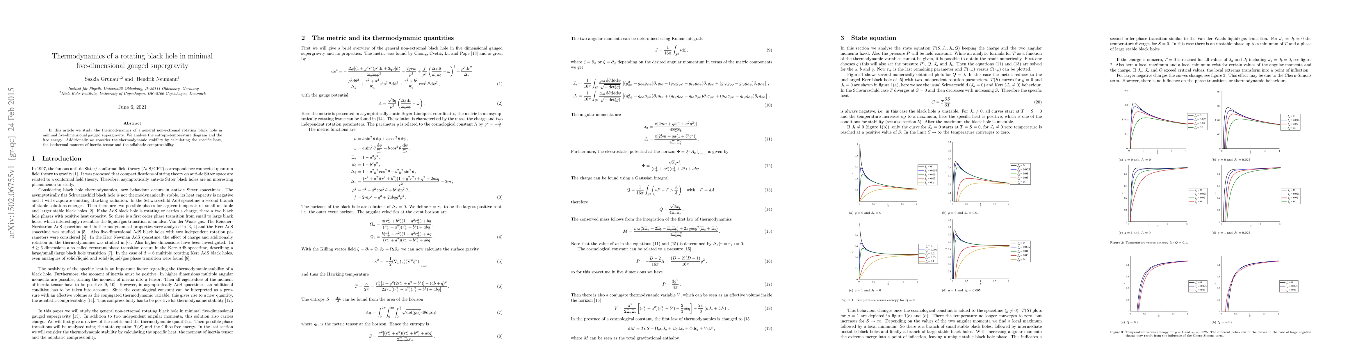This paper investigates the thermodynamics of rotating black holes in a specific theoretical framework, analyzing entropy-temperature diagrams, free energy, stability, and more. Key findings include insights into the behavior of non-extremal rotating black holes in minimal five-dimensional gauged supergravity.