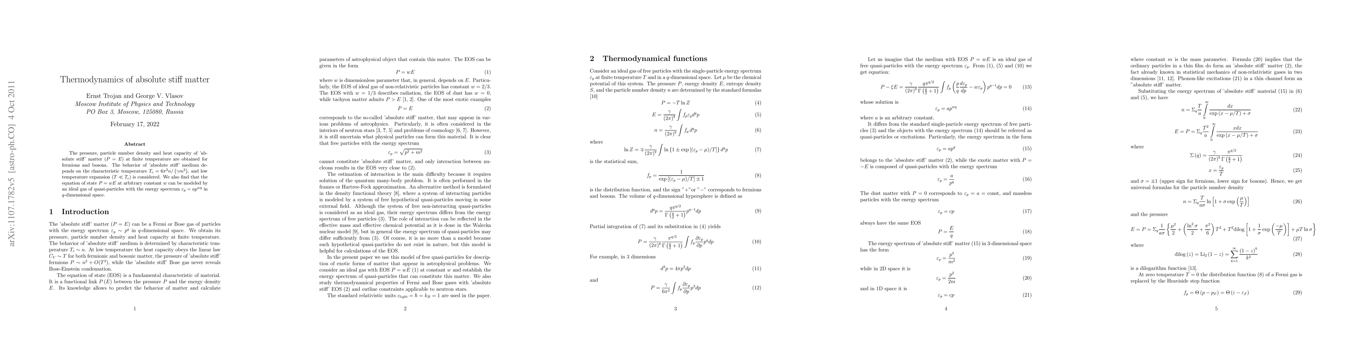 The 'absolute stiff' matter ($P=E$) can be a Fermi or Bose gas of particles with the energy spectrum $\epsilon_p \sim p^q$ in $q$-dimensional space, particularly $\epsilon_p =p^3/m^2$ in 3-dimensional space. We obtain its pressure, particle number density and heat capacity at finite temperature. The behavior of 'absolute stiff' medium is determined by characteristic temperature $T_c=6\pi ^2n/(\gamma m^2)$. At low temperature the heat capacity obeys the linear law $C_V\sim T$ for both fermionic and bosonic matter, the pressure of 'absolute stiff' fermions $P\sim n^2+O(T^2)$, while the 'absolute stiff' Bose gas never reveals Bose-Einstein condensation.