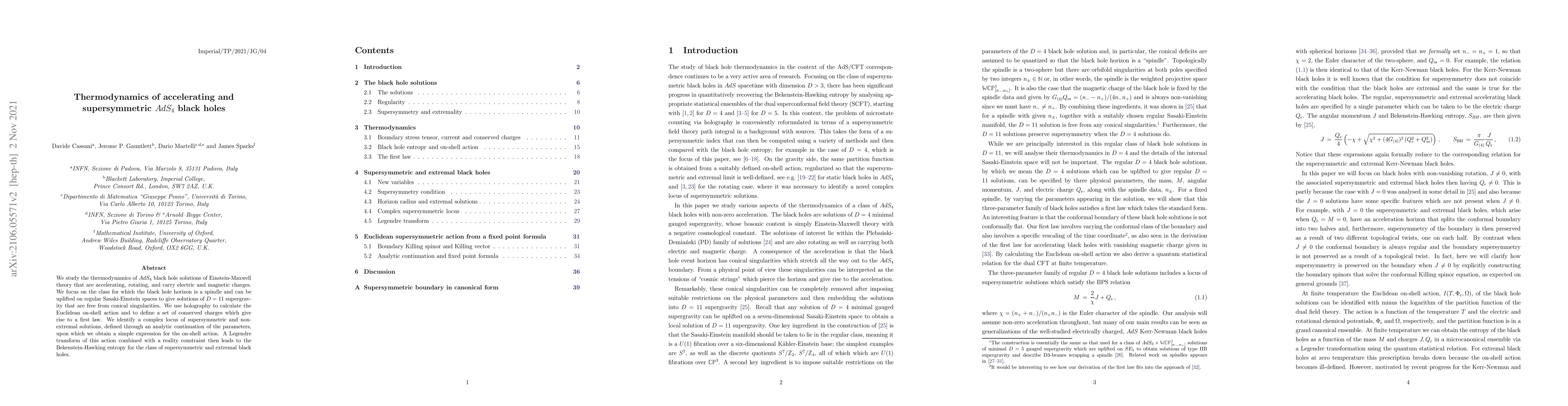 We study the thermodynamics of $AdS_4$ black hole solutions of Einstein-Maxwell theory that are accelerating, rotating, and carry electric and magnetic charges. We focus on the class for which the black hole horizon is a spindle and can be uplifted on regular Sasaki-Einstein spaces to give solutions of $D=11$ supergravity that are free from conical singularities. We use holography to calculate the Euclidean on-shell action and to define a set of conserved charges which give rise to a first law. We identify a complex locus of supersymmetric and non-extremal solutions, defined through an analytic continuation of the parameters, upon which we obtain a simple expression for the on-shell action. A Legendre transform of this action combined with a reality constraint then leads to the Bekenstein-Hawking entropy for the class of supersymmetric and extremal black holes.