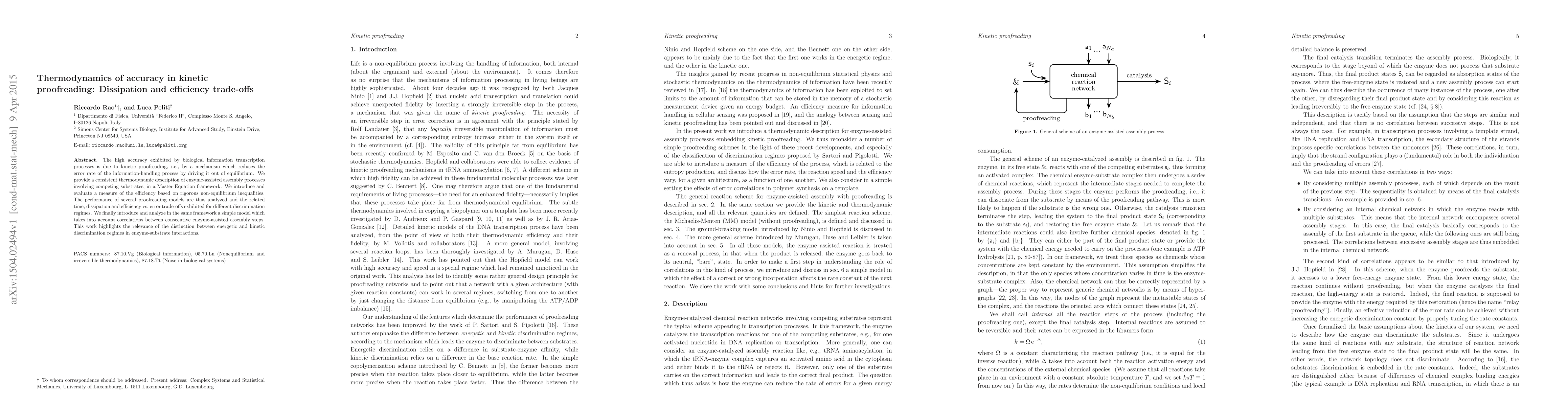 The high accuracy exhibited by biological information transcription processes is due to kinetic proofreading, i.e., by a mechanism which reduces the error rate of the information-handling process by driving it out of equilibrium. We provide a consistent thermodynamic description of enzyme-assisted assembly processes involving competing substrates, in a Master Equation framework. We introduce and evaluate a measure of the efficiency based on rigorous non-equilibrium inequalities. The performance of several proofreading models are thus analyzed and the related time, dissipation and efficiency vs. error trade-offs exhibited for different discrimination regimes. We finally introduce and analyze in the same framework a simple model which takes into account correlations between consecutive enzyme-assisted assembly steps. This work highlights the relevance of the distinction between energetic and kinetic discrimination regimes in enzyme-substrate interactions.