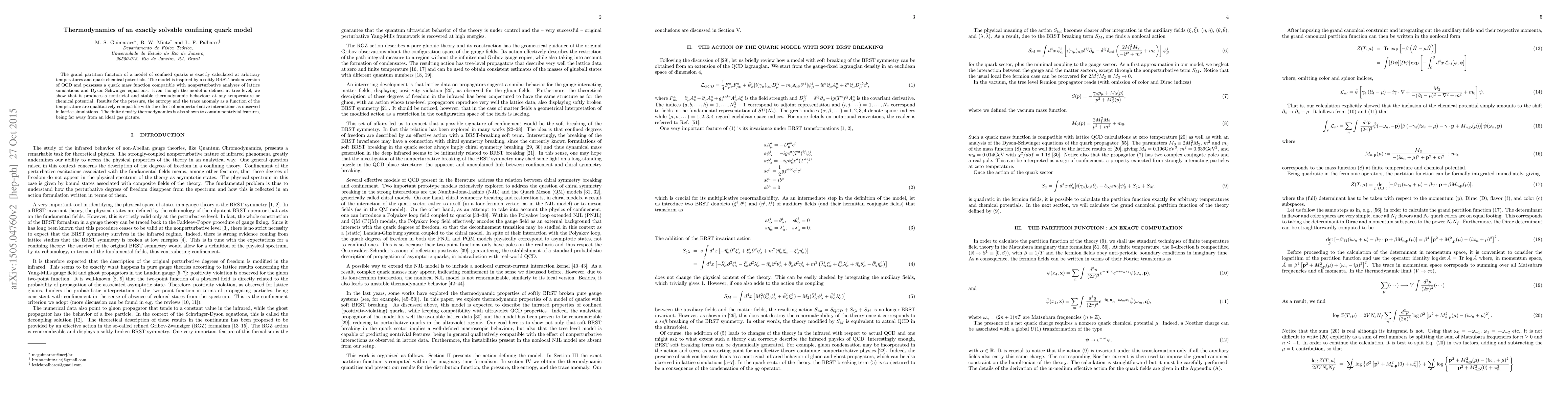 The grand partition function of a model of confined quarks is exactly calculated at arbitrary temperatures and quark chemical potentials. The model is inspired by a softly BRST-broken version of QCD and possesses a quark mass function compatible with nonperturbative analyses of lattice simulations and Dyson-Schwinger equations. Even though the model is defined at tree level, we show that it produces a nontrivial and stable thermodynamic behaviour at any temperature or chemical potential. Results for the pressure, the entropy and the trace anomaly as a function of the temperature are qualitatively compatible with the effect of nonperturbative interactions as observed in lattice simulations. The finite density thermodynamics is also shown to contain nontrivial features, being far away from an ideal gas picture.