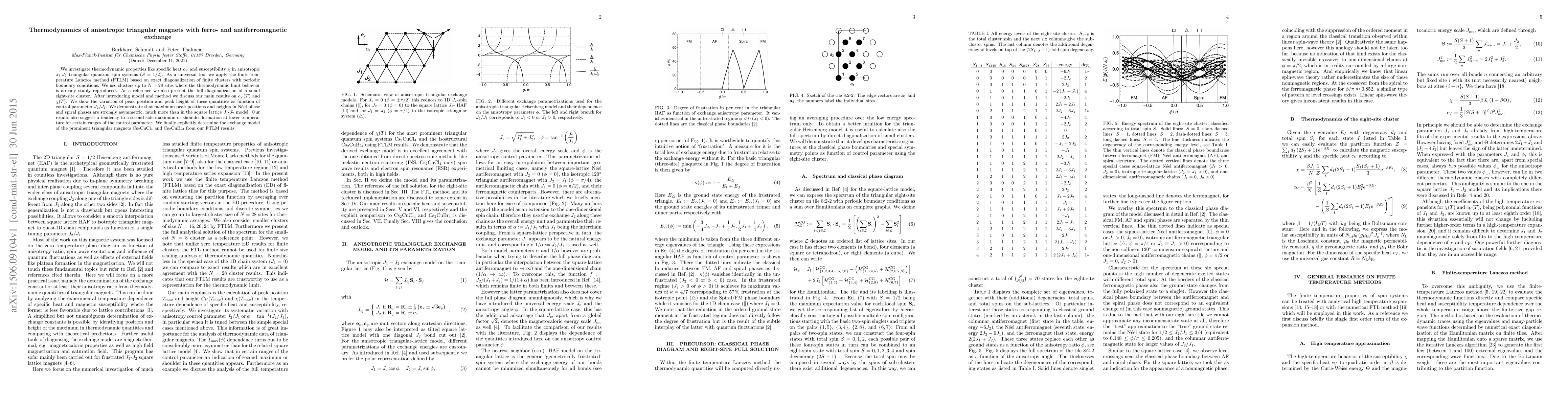 We investigate thermodynamic properties like specific heat $c_{V}$ and susceptibility $\chi$ in anisotropic $J_1$-$J_2$ triangular quantum spin systems ($S=1/2$). As a universal tool we apply the finite temperature Lanczos method (FTLM) based on exact diagonalization of finite clusters with periodic boundary conditions. We use clusters up to $N=28$ sites where the thermodynamic limit behavior is already stably reproduced. As a reference we also present the full diagonalization of a small eight-site cluster. After introducing model and method we discuss our main results on $c_V(T)$ and $\chi(T)$. We show the variation of peak position and peak height of these quantities as function of control parameter $J_2/J_1$. We demonstrate that maximum peak positions and heights in N\'eel phase and spiral phases are strongly asymmetric, much more than in the square lattice $J_1$-$J_2$ model. Our results also suggest a tendency to a second side maximum or shoulder formation at lower temperature for certain ranges of the control parameter. We finally explicitly determine the exchange model of the prominent triangular magnets Cs$_2$CuCl$_4$ and Cs$_{2}$CuBr$_{4}$ from our FTLM results.