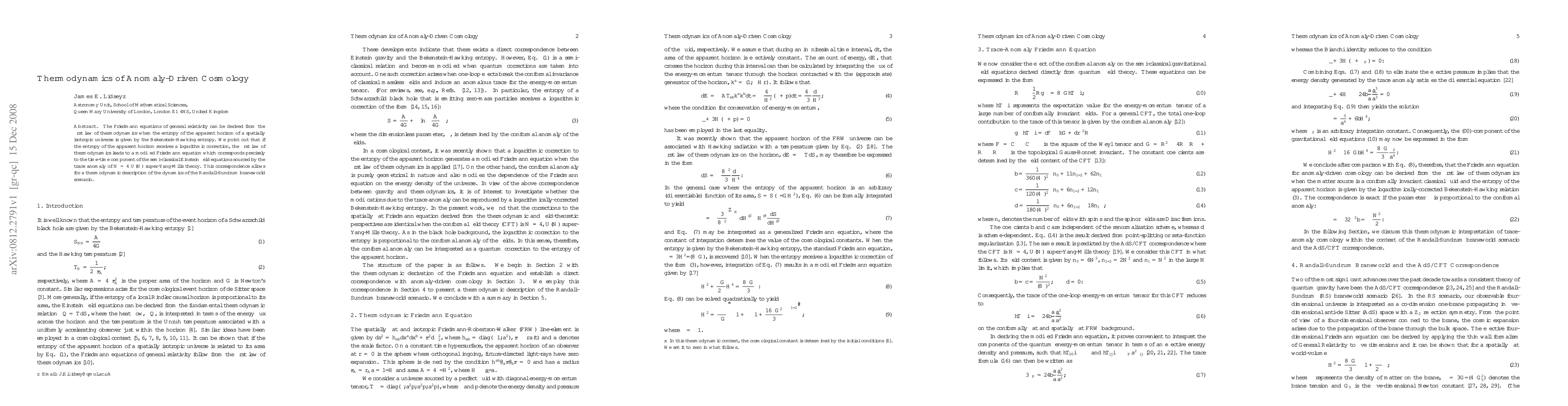The Friedmann equations of general relativity can be derived from the first law of thermodynamics when the entropy of the apparent horizon of a spatially isotropic universe is given by the Bekenstein-Hawking entropy. We point out that if the entropy of the apparent horizon receives a logarithmic correction, the first law of thermodynamics leads to a modified Friedmann equation which corresponds precisely to the time-time component of the semi-classical Einstein field equations sourced by the trace anomaly of ${\cal{N}}=4$ U(N) super-Yang-Mills theory. This correspondence allows for a thermodynamic description of the dynamics of the Randall-Sundrum braneworld scenario.