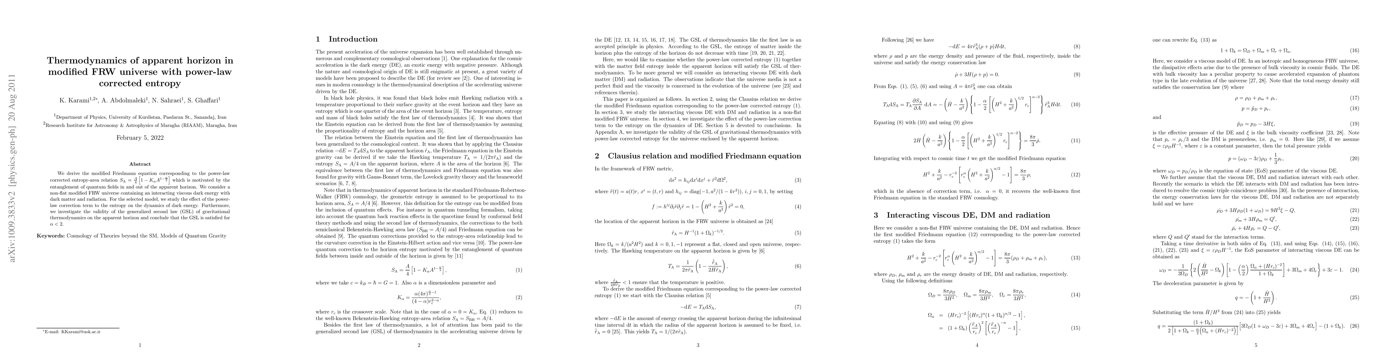 We derive the modified Friedmann equation corresponding to the power-law corrected entropy-area relation $S_{\rm A}=\frac{A}{4}[1-K_{\alpha} A^{1-\frac{\alpha}{2}}]$ which is motivated by the entanglement of quantum fields in and out of the apparent horizon. We consider a non-flat modified FRW universe containing an interacting viscous dark energy with dark matter and radiation. For the selected model, we study the effect of the power-law correction term to the entropy on the dynamics of dark energy. Furthermore, we investigate the validity of the generalized second law (GSL) of gravitational thermodynamics on the apparent horizon and conclude that the GSL is satisfied for $\alpha<2$.