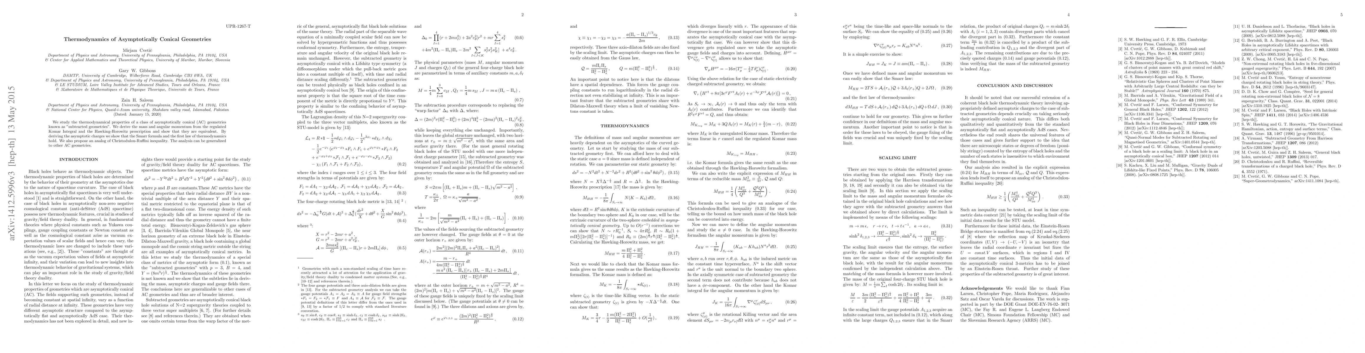 We study the thermodynamical properties of a class of asymptotically conical (AC) geometries known as "subtracted geometries". We derive the mass and angular momentum from the regulated Komar Integral and the Hawking-Horowitz prescription and show that they are equivalent. By deriving the asymptotic charges we show that the Smarr formula and the first law of thermodynamics hold. We also propose an analog of Christodulou-Ruffini inequality. The analysis can be generalized to other AC geometries.
