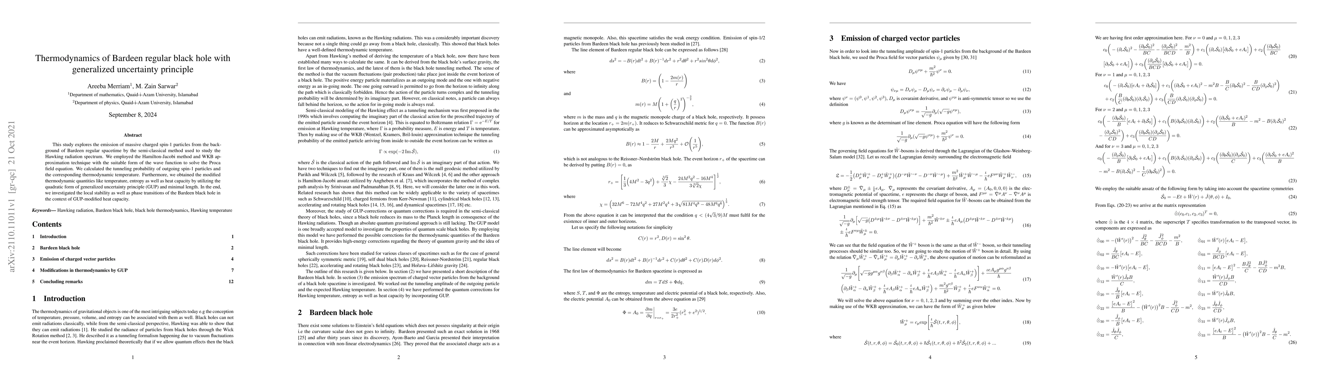 This study explores the emission of massive charged spin-1 particles from the background of Bardeen regular spacetime by the semi-classical method used to study the Hawking radiation spectrum. We employed the Hamilton-Jacobi method and WKB approximation technique with the suitable form of the wave function to solve the Proca field equation. We calculated the tunneling probability of outgoing spin-1 particles and the corresponding thermodynamic temperature. Furthermore, we obtained the modified thermodynamic quantities like temperature, entropy as well as heat capacity by utilizing the quadratic form of generalized uncertainty principle (GUP) and minimal length. In the end, we investigated the local stability as well as phase transitions of the Bardeen black hole in the context of GUP-modified heat capacity.