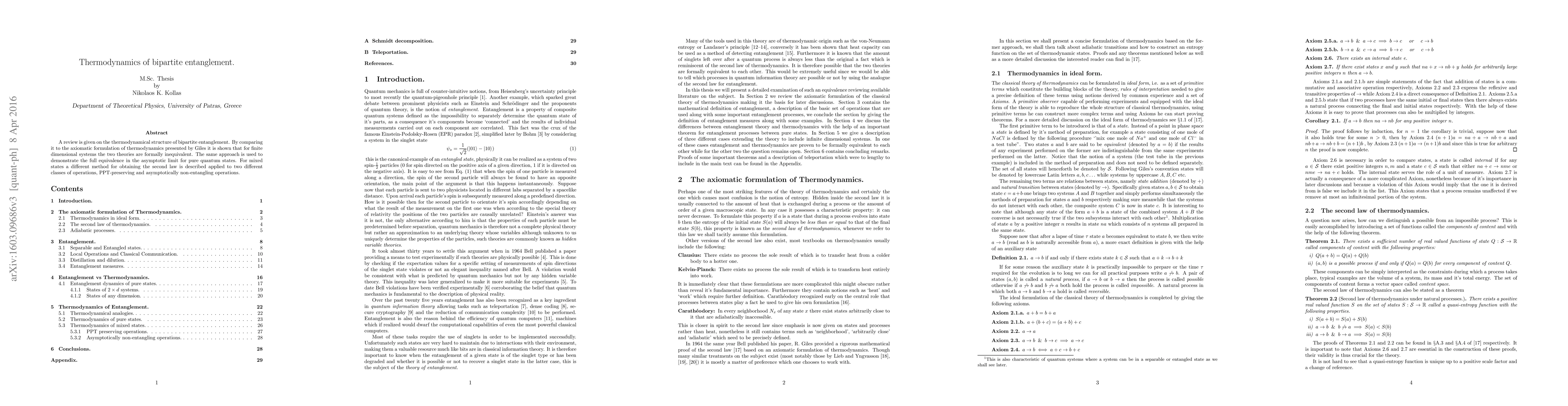 A review is given on the thermodynamical structure of bipartite entanglement. By comparing it to the axiomatic formulation of thermodynamics presented by Giles it is shown that for finite dimensional systems the two theories are formally inequivalent. The same approach is used to demonstrate the full equivalence in the asymptotic limit for pure quantum states. For mixed states a different method for obtaining the second law is described applied to two different classes of operations, PPT-preserving and asymptotically non-entangling operations.