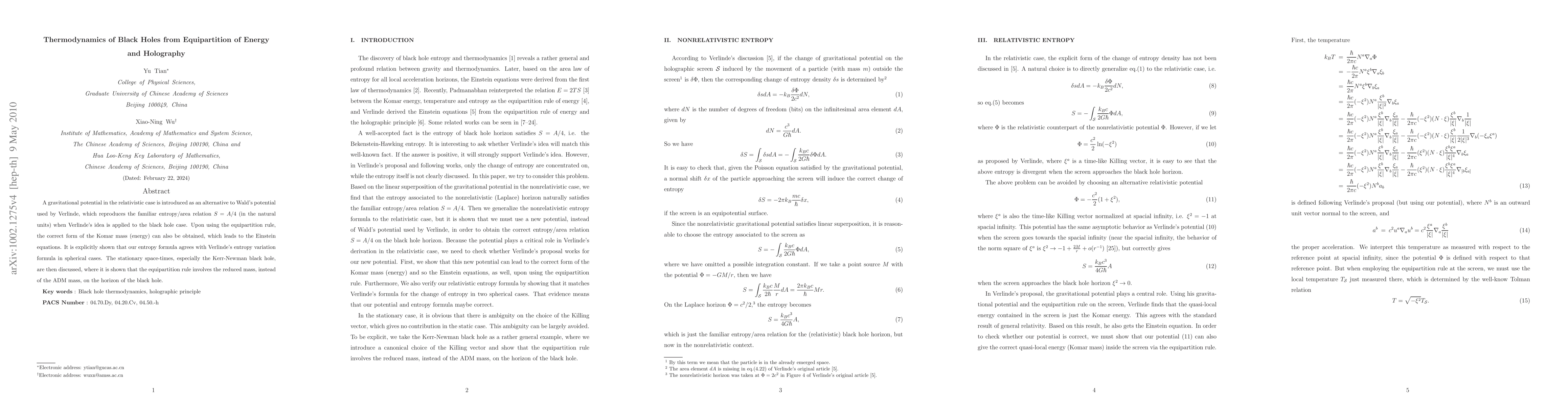 A gravitational potential in the relativistic case is introduced as an alternative to Wald's potential used by Verlinde, which reproduces the familiar entropy/area relation S=A/4 (in the natural units) when Verlinde's idea is applied to the black hole case. Upon using the equipartition rule, the correct form of the Komar mass (energy) can also be obtained, which leads to the Einstein equations. It is explicitly shown that our entropy formula agrees with Verlinde's entropy variation formula in spherical cases. The stationary space-times, especially the Kerr-Newman black hole, are then discussed, where it is shown that the equipartition rule involves the reduced mass, instead of the ADM mass, on the horizon of the black hole.
