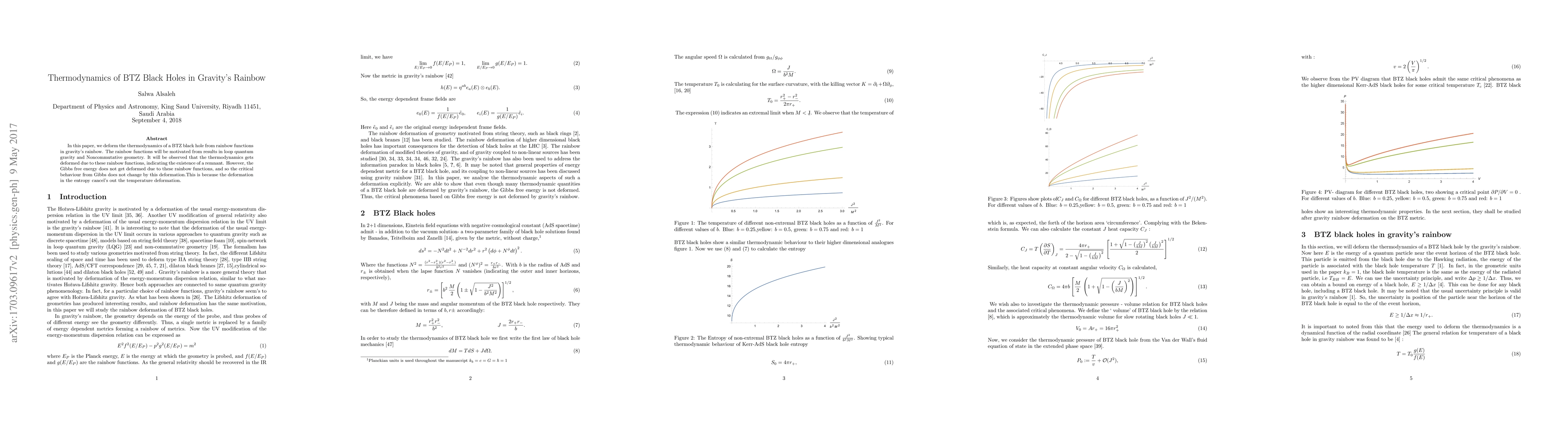 In this paper, we deform the thermodynamics of a BTZ black hole from rainbow functions in gravity's rainbow. The rainbow functions will be motivated from results in loop quantum gravity and Noncommutative geometry. It will be observed that the thermodynamics gets deformed due to these rainbow functions, indicating the existence of a remnant. However, the Gibbs free energy does not get deformed due to these rainbow functions, and so the critical behaviour from Gibbs does not change by this deformation.This is because the deformation in the entropy cancel's out the temperature deformation.