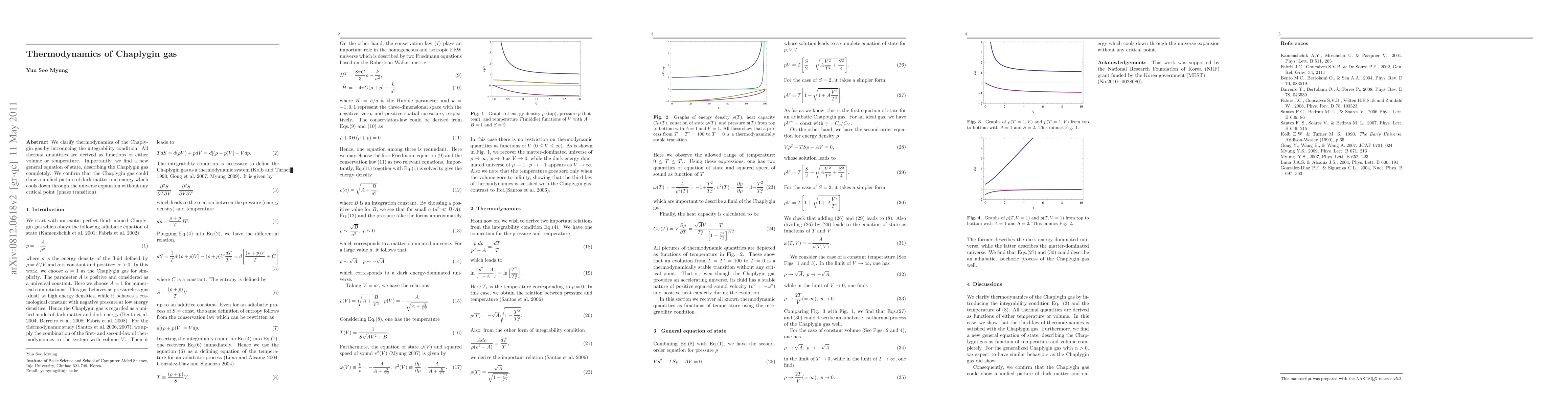 This paper derives the thermodynamics of Chaplygin gas, introducing an integrability condition to derive thermal quantities and a new general equation of state. It concludes that Chaplygin gas can represent a unified model of dark matter and energy that cools without phase transition during cosmic expansion.