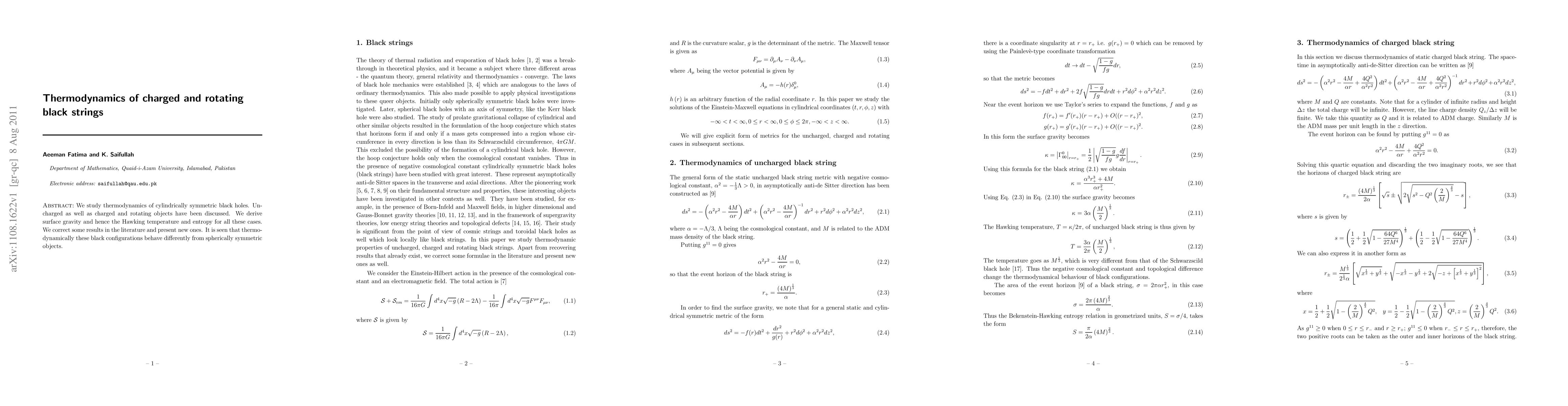 This paper investigates the thermodynamics of cylindrically symmetric black strings, including uncharged, charged, and rotating variants, deriving surface gravity, Hawking temperature, and entropy. It corrects previous findings and highlights distinct thermodynamic behaviors compared to spherically symmetric black holes.