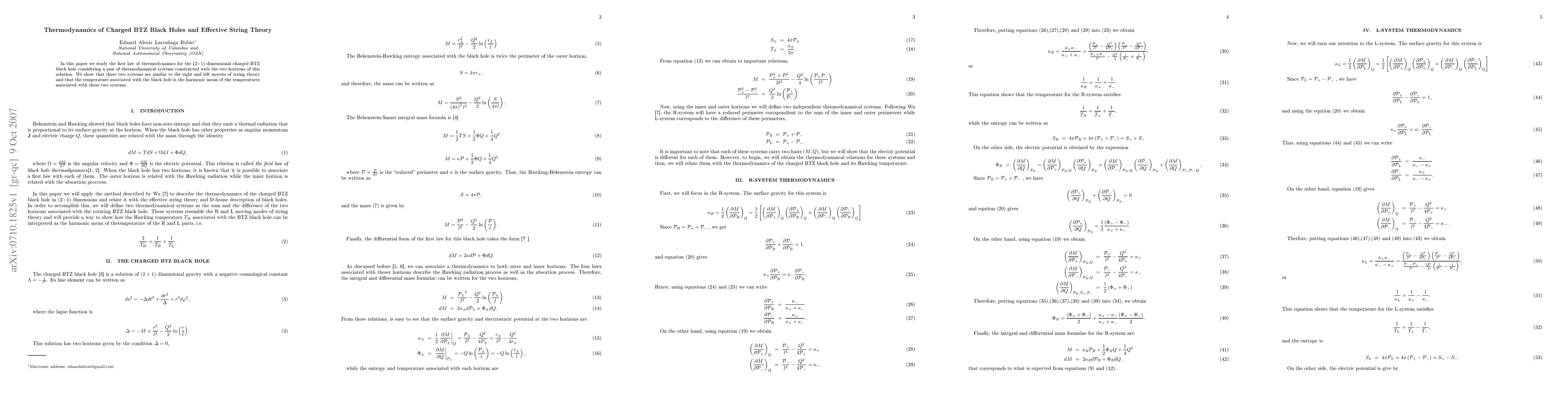 This paper investigates the thermodynamics of (2+1)-dimensional charged BTZ black holes, demonstrating that the first law of thermodynamics applies to systems constructed from the black hole's two horizons, which resemble string theory's right and left movers, with the black hole's temperature being the harmonic mean of the two horizon temperatures.