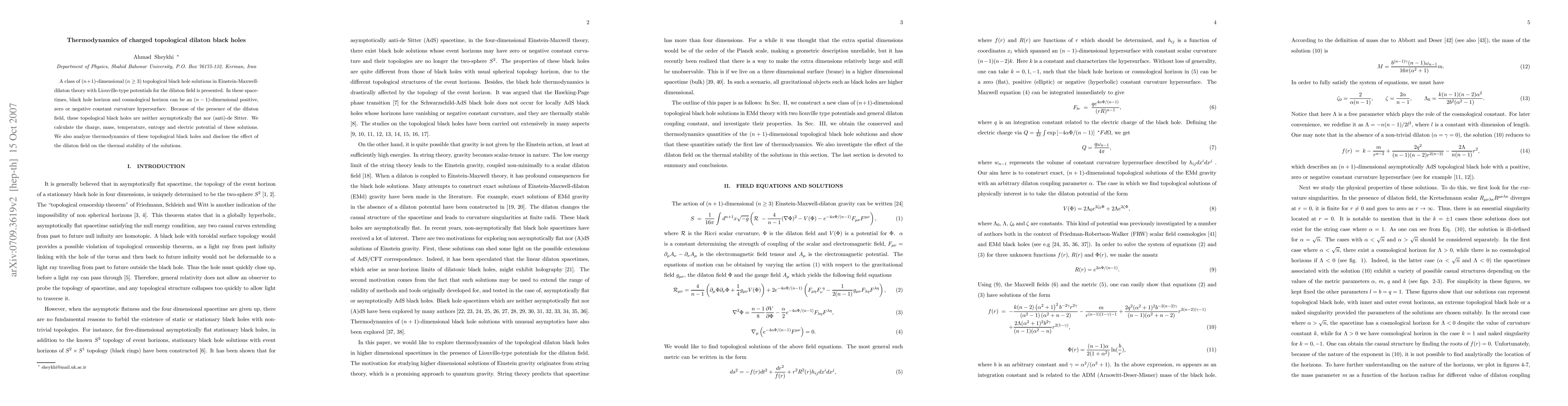 This paper investigates $(n+1)$-dimensional topological dilaton black holes in Einstein-Maxwell-dilaton theory, examining their thermodynamic properties including charge, mass, temperature, entropy, and electric potential. It highlights the impact of the dilaton field on the thermal stability of these non-(anti)-de Sitter black holes.