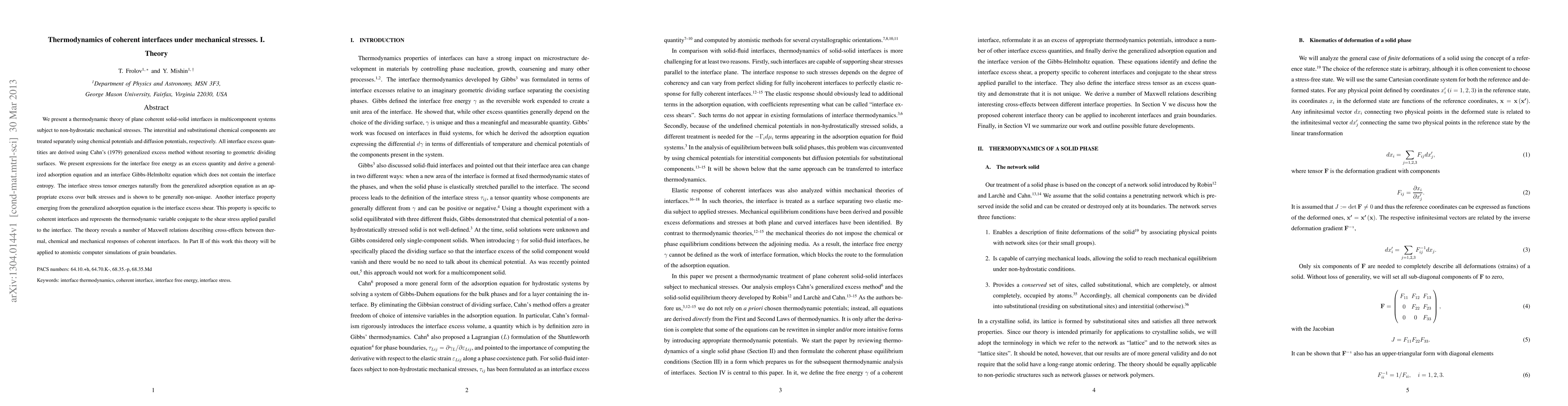 This paper develops a thermodynamic theory for plane coherent solid-solid interfaces under mechanical stresses, deriving expressions for interface free energy, generalized adsorption, and Gibbs-Helmholtz equations, and introducing the interface stress tensor and excess shear. The theory reveals Maxwell relations for cross-effects between thermal, chemical, and mechanical responses.