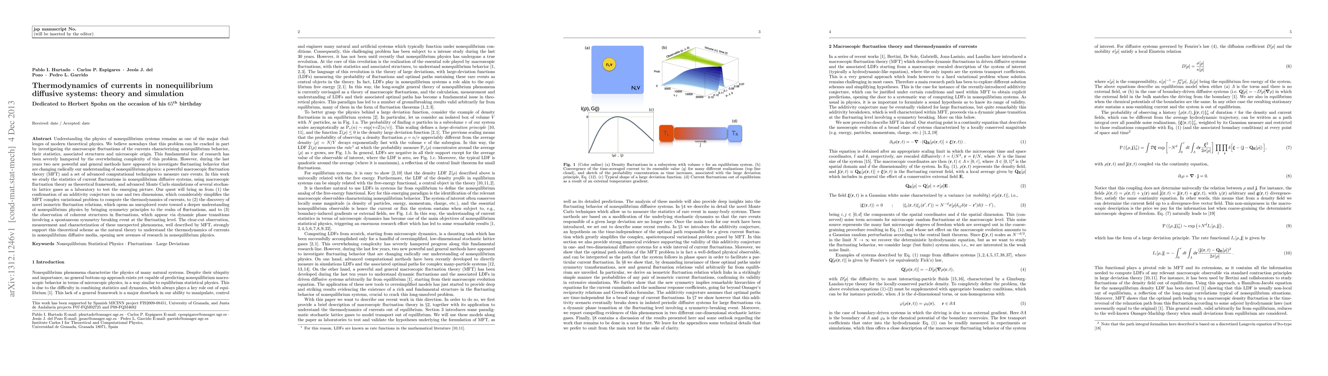 Understanding the physics of nonequilibrium systems remains as one of the major challenges of theoretical physics. This problem can be cracked in part by investigating the macroscopic fluctuations of the currents characterizing nonequilibrium behavior, their statistics and associated structures. This fundamental line of research has been severely hampered by the overwhelming complexity of this problem. However, during the last years two new general methods have appeared to investigate fluctuating behavior that are changing radically our understanding of nonequilibrium physics: a powerful macroscopic fluctuation theory (MFT) and a set of advanced computational techniques to measure rare events. In this work we study the statistics of current fluctuations in nonequilibrium diffusive systems, using macroscopic fluctuation theory as theoretical framework, and advanced Monte Carlo simulations of several stochastic lattice gases as a laboratory to test the emerging picture. Our quest will bring us from (1) the confirmation of an additivity conjecture in one and two dimensions, which considerably simplifies the MFT complex variational problem to compute the thermodynamics of currents, to (2) the discovery of novel isometric fluctuation relations, which opens an unexplored route toward a deeper understanding of nonequilibrium physics by bringing symmetry principles to the realm of fluctuations, and to (3) the observation of coherent structures in fluctuations, which appear via dynamic phase transitions involving a spontaneous symmetry breaking event at the fluctuating level. The clear-cut observation, measurement and characterization of these unexpected phenomena, well described by MFT, strongly support this theoretical scheme as the natural theory to understand the thermodynamics of currents in nonequilibrium diffusive media, opening new avenues of research in nonequilibrium physics.