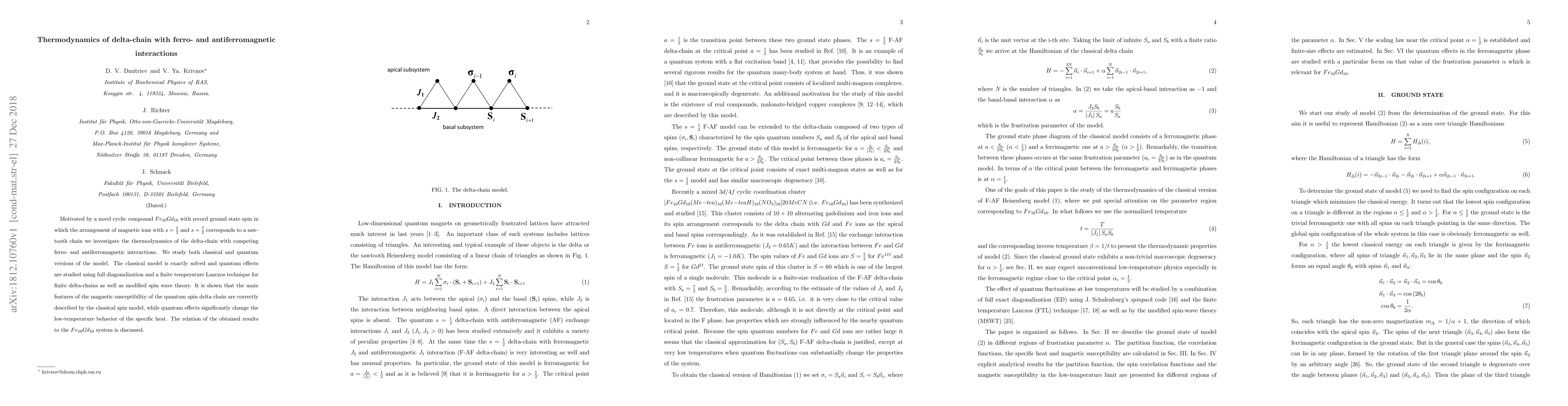 The paper presents a comprehensive study combining classical and quantum approaches to analyze the thermodynamics of a delta-chain model with competing interactions, providing exact solutions and detailed finite-temperature analyses.