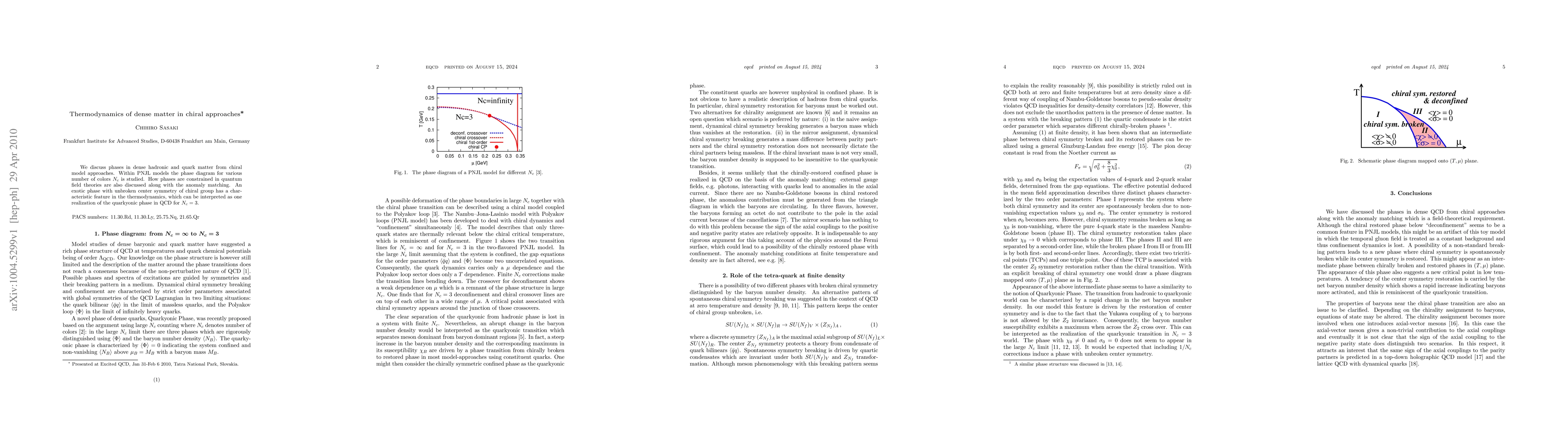 This paper explores phases in dense hadronic and quark matter using chiral models and PNJL approaches, focusing on the phase diagram for different colors $N_c$. It highlights an exotic phase with unbroken center symmetry, interpreted as a realization of the quarkyonic phase in QCD for $N_c=3$.