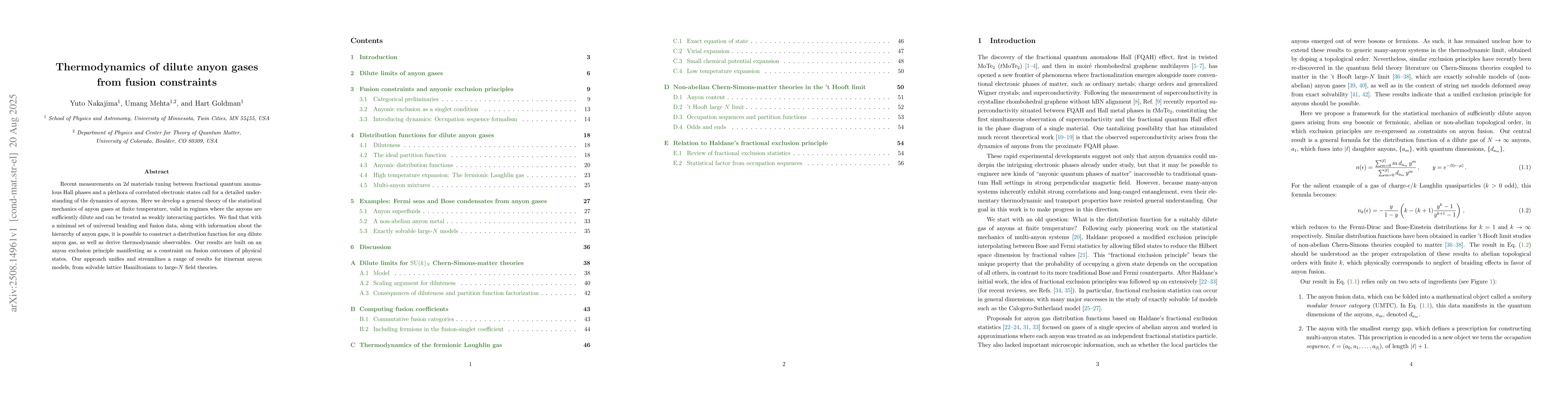 Recent measurements on 2d materials tuning between fractional quantum anomalous Hall phases and a plethora of correlated electronic states call for a detailed understanding of the dynamics of anyons. Here we develop a general theory of the statistical mechanics of anyon gases at finite temperature, valid in regimes where the anyons are sufficiently dilute and can be treated as weakly interacting particles. We find that with a minimal set of universal braiding and fusion data, along with information about the hierarchy of anyon gaps, it is possible to construct a distribution function for any dilute anyon gas, as well as derive thermodynamic observables. Our results are built on an anyon exclusion principle manifesting as a constraint on fusion outcomes of physical states. Our approach unifies and streamlines a range of results for itinerant anyon models, from solvable lattice Hamiltonians to large-N field theories.