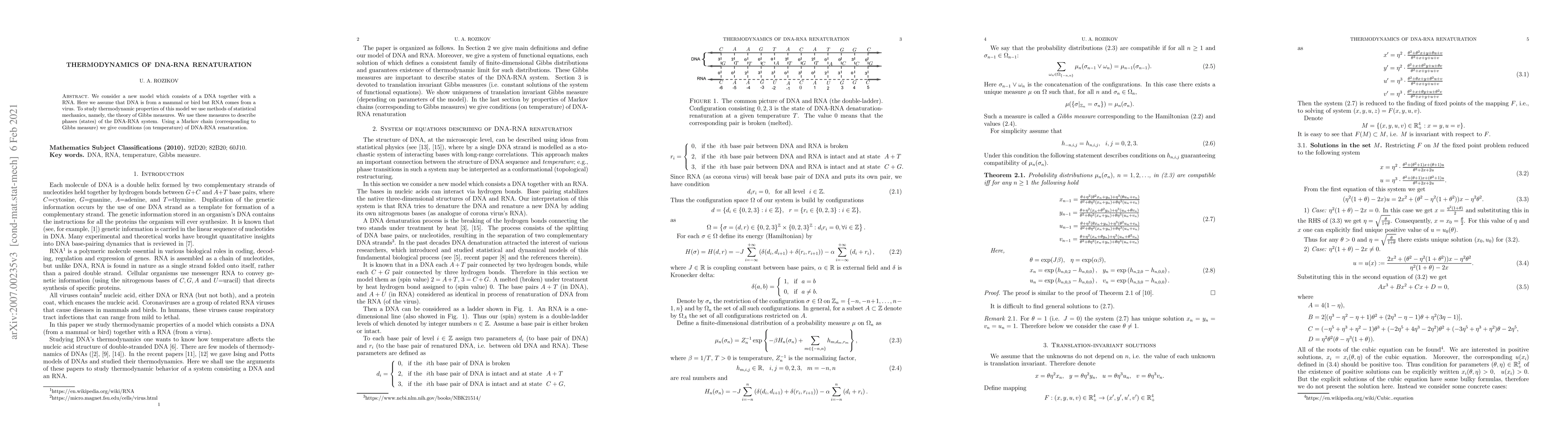 We consider a new model which consists of a DNA together with a RNA. Here we assume that DNA is from a mammal or bird but RNA comes from a virus. To study thermodynamic properties of this model we use methods of statistical mechanics, namely, the theory of Gibbs measures. We use these measures to describe phases (states) of the DNA-RNA system. Using a Markov chain (corresponding to Gibbs measure) we give conditions (on temperature) of DNA-RNA renaturation.