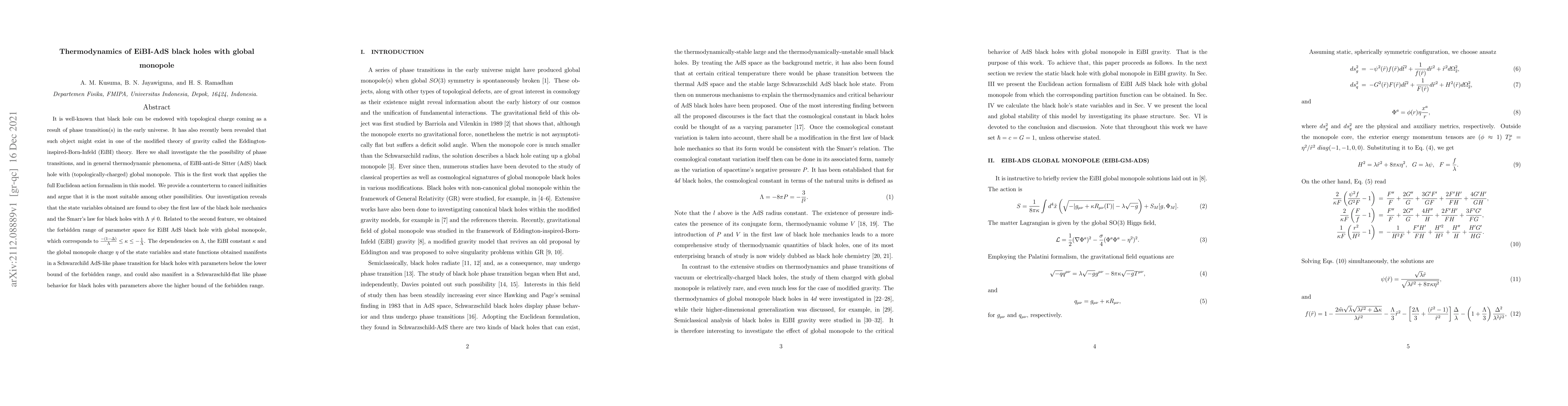 It is well-known that black hole can be endowed with topological charge coming as a result of phase transition(s) in the early universe. It has also recently been revealed that such object might exist in one of the modified theory of gravity called the Eddington-inspired-Born-Infeld (EiBI) theory. Here we shall investigate the the possibility of phase transitions, and in general thermodynamic phenomena, of EiBI-anti-de Sitter (AdS) black hole with (topologically-charged) global monopole. This is the first work that applies the full Euclidean action formalism in this model. We provide a counterterm to cancel inifinities and argue that it is the most suitable among other possibilities. Our investigation reveals that the state variables obtained are found to obey the first law of the black hole mechanics and the Smarr's law for black holes with $\Lambda\neq0$. Related to the second feature, we obtained the forbidden range of parameter space for EiBI AdS black hole with global monopole, which corresponds to $\frac{-(1 - \Delta)}{\Lambda } \leq \kappa \leq -\frac{1}{\Lambda }$. The dependencies on $\Lambda$, the EiBI constant $\kappa$ and the global monopole charge $\eta$ of the state variables and state functions obtained manifests in a Schwarzchild AdS-like phase transition for black holes with parameters below the lower bound of the forbidden range, and could also manifest in a Schwarzschild-flat like phase behavior for black holes with parameters above the higher bound of the forbidden range.
