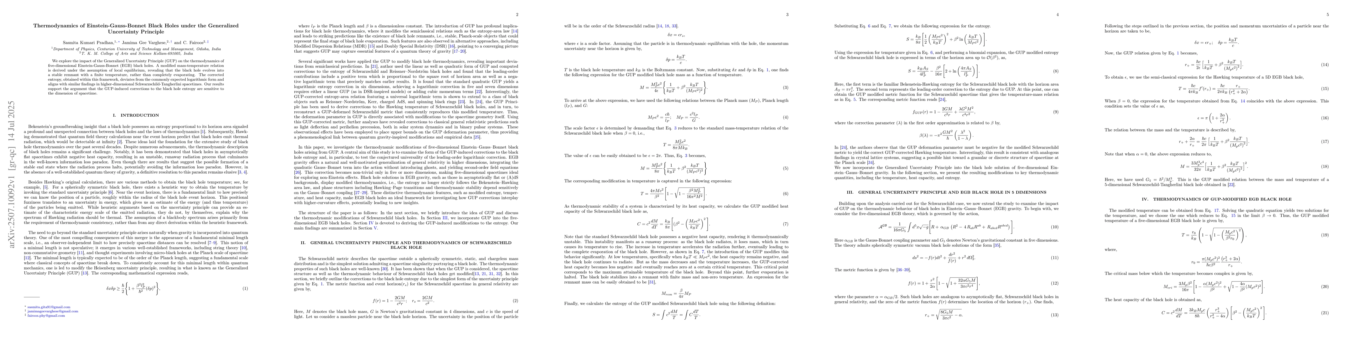 We explore the impact of the Generalized Uncertainty Principle (GUP) on the thermodynamics of five-dimensional Einstein-Gauss-Bonnet (EGB) black holes. A modified mass-temperature relation is derived under the assumption of local equilibrium, revealing that the black hole evolves into a stable remnant with a finite temperature, rather than completely evaporating. The corrected entropy, obtained within this framework, deviates from the commonly expected logarithmic form and aligns with similar findings in higher-dimensional Schwarzschild-Tangherlini spacetimes. Our results support the argument that the GUP-induced corrections to the black hole entropy are sensitive to the dimension of spacetime.