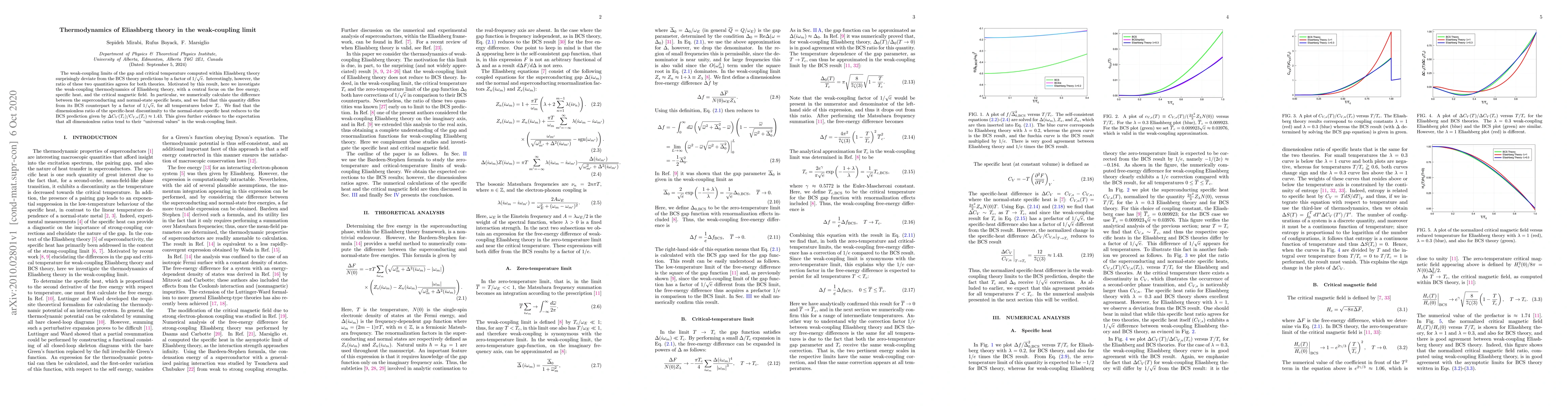 This paper investigates the thermodynamics of Eliashberg theory in the weak-coupling limit, finding that while gap and critical temperature deviate from BCS predictions by a factor of $1/\sqrt{e}$, the dimensionless ratios of thermodynamic quantities like specific heat and critical magnetic field converge to BCS values. This supports the notion that universal ratios hold in weak-coupling superconductors.
