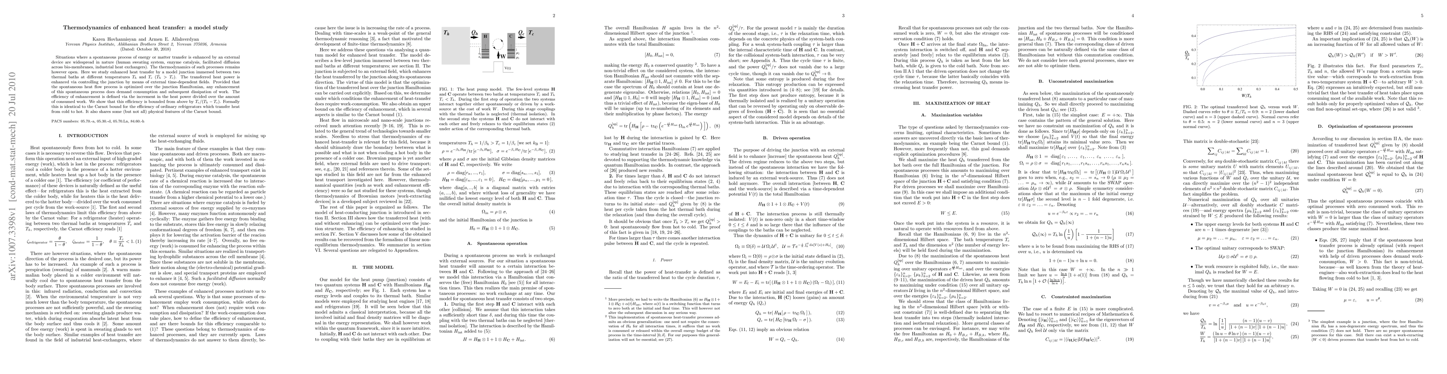 Situations where a spontaneous process of energy or matter transfer is enhanced by an external device are widespread in nature (human sweating system, enzyme catalysis, facilitated diffusion across bio-membranes, industrial heat exchangers). The thermodynamics of such processes remains however open. Here we study enhanced heat transfer by a model junction immersed between two thermal baths at different temperatures $T_h$ and $T_c$ ($T_h>T_c$). The transferred heat power is enhanced via controlling the junction by means of external time-dependent fields. Provided that the spontaneous heat flow process is optimized over the junction Hamiltonian, any enhancement of this spontaneous process does demand consumption and subsequent dissipation of work. The efficiency of enhancement is defined via the increment in the heat power divided over the amount of consumed work. We show that this efficiency is bounded from above by $T_c/(T_h-T_c)$. Formally this is identical to the Carnot bound for the efficiency of ordinary refrigerators which transfer heat from cold to hot. It also shares some (but not all) physical features of the Carnot bound.
