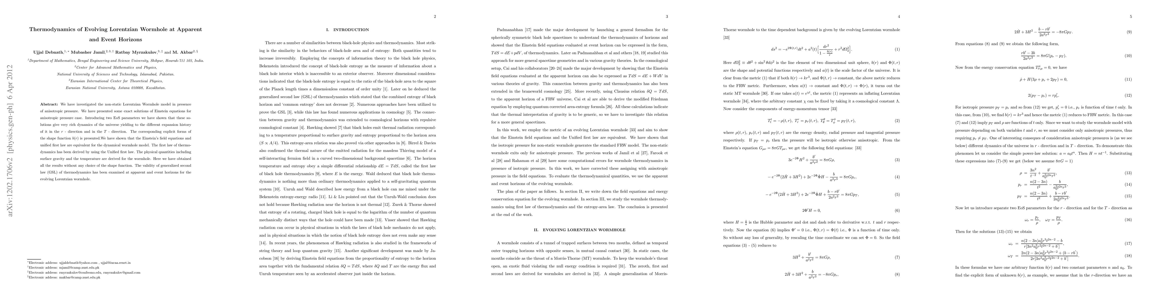 We have investigated the non-static Lorentzian Wormhole model in presence of anisotropic pressure. We have presented some exact solutions of Einstein equations for anisotropic pressure case. Introducing two EoS parameters we have shown that these solutions give very rich dynamics of the universe yielding to the different expansion history of it in the $r$ - direction and in the $T$ - direction. The corresponding explicit forms of the shape function $b(r)$ is presented.We have shown that the Einstein's field equations and unified first law are equivalent for the dynamical wormhole model. The first law of thermodynamics has been derived by using the Unified first law. The physical quantities including surface gravity and the temperature are derived for the wormhole. Here we have obtained all the results without any choice of the shape function. The validity of generalized second law (GSL) of thermodynamics has been examined at apparent and event horizons for the evolving Lorentzian wormhole.