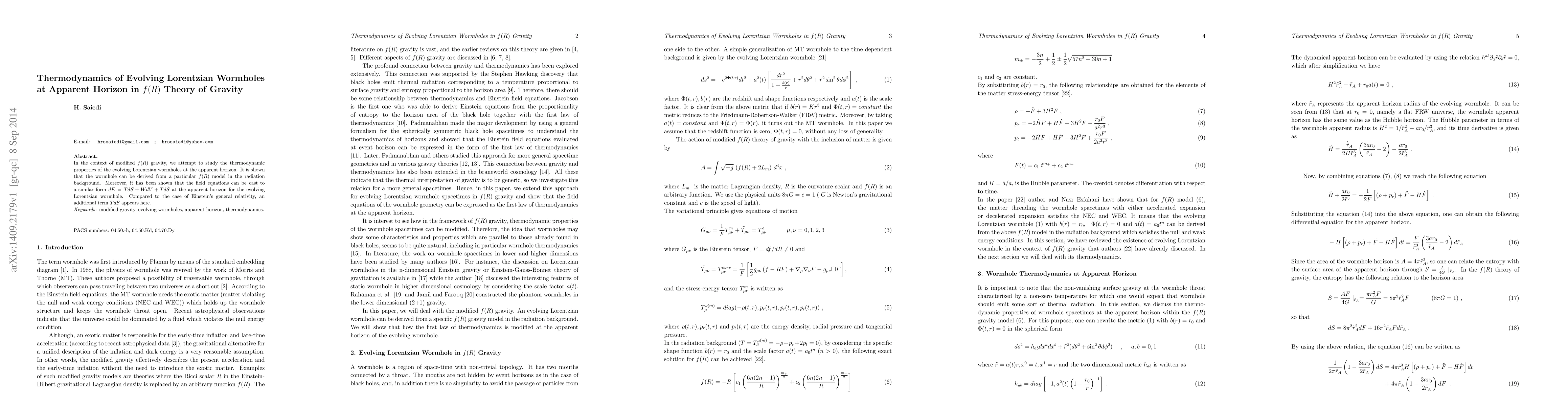 This paper explores the thermodynamics of evolving Lorentzian wormholes in the framework of $f(R)$ gravity, demonstrating that these wormholes can be derived from a specific $f(R)$ model in a radiation background. The study reveals that the field equations relate energy, entropy, volume, and an additional term $Td\bar{S}$ at the apparent horizon, distinguishing it from general relativity.