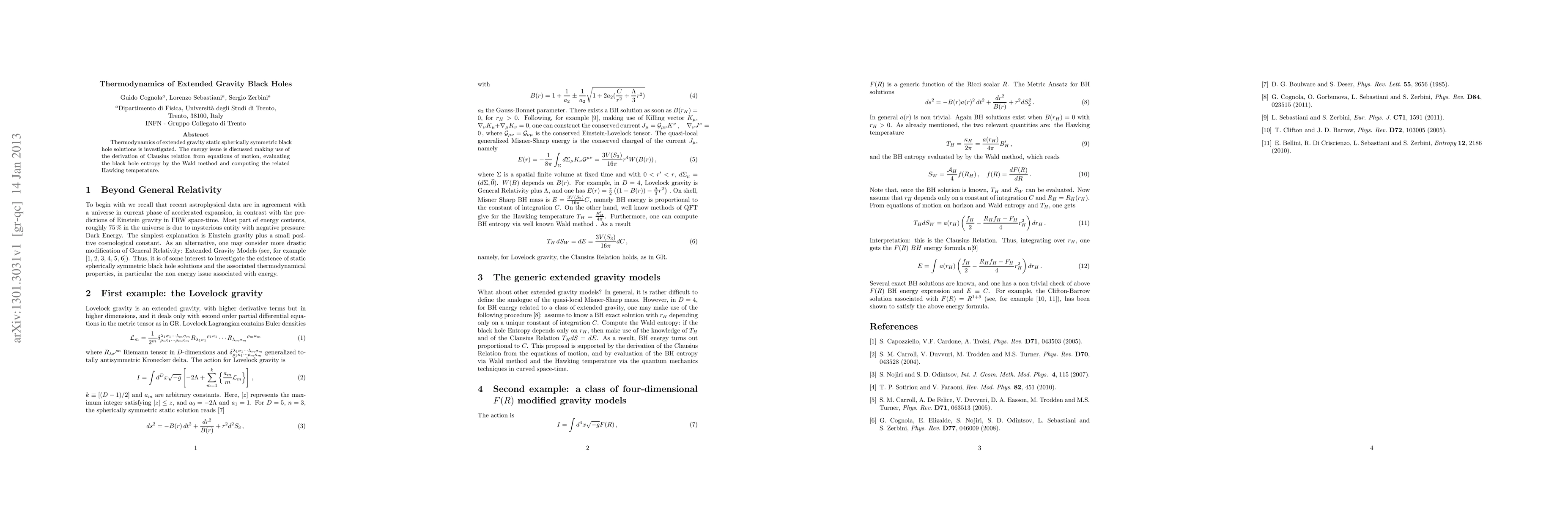 This paper investigates the thermodynamics of extended gravity black holes, deriving the Clausius relation from their equations of motion and using the Wald method to evaluate black hole entropy and compute the associated Hawking temperature.