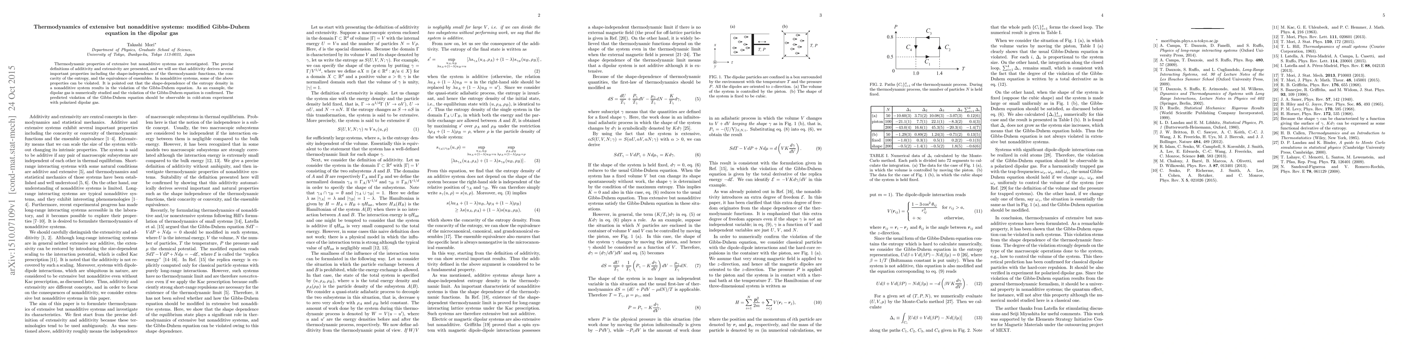 This paper investigates the thermodynamics of extensive but nonadditive systems, focusing on the violation of the Gibbs-Duhem equation in dipolar gases. It confirms the shape-dependence of entropy density in nonadditive systems and predicts that this violation can be observed in cold-atom experiments with polarized dipolar gas.