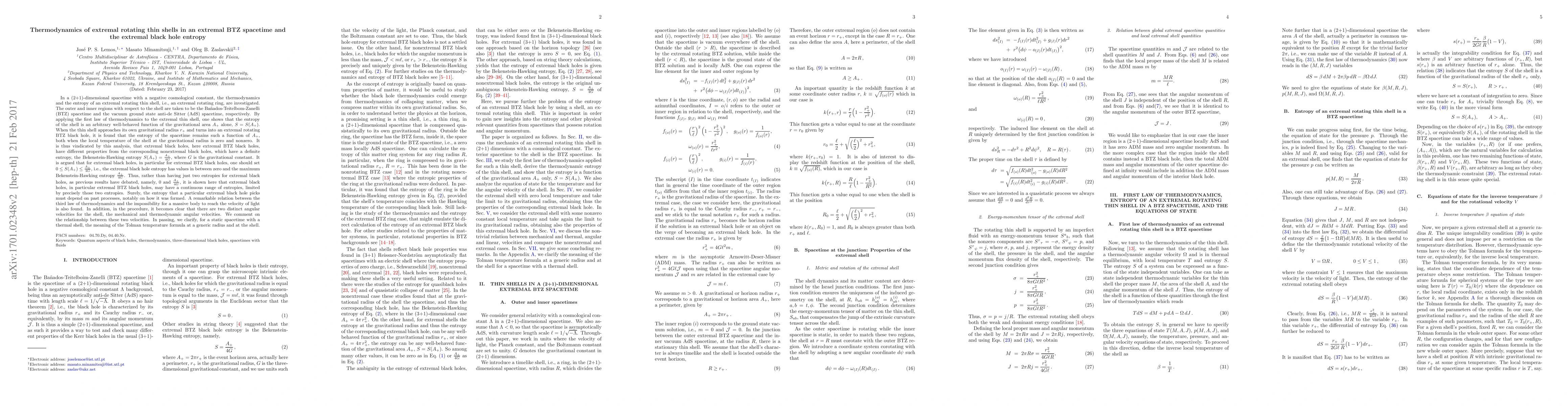 This paper examines the thermodynamics of an extremal rotating thin shell in a (2+1)-dimensional BTZ spacetime, showing its entropy is a function of the gravitational area alone. It reveals that extremal BTZ black holes possess a continuous range of entropies, challenging previous notions of fixed entropy values, and discusses the distinct angular velocities of the shell and the implications for the third law of thermodynamics.