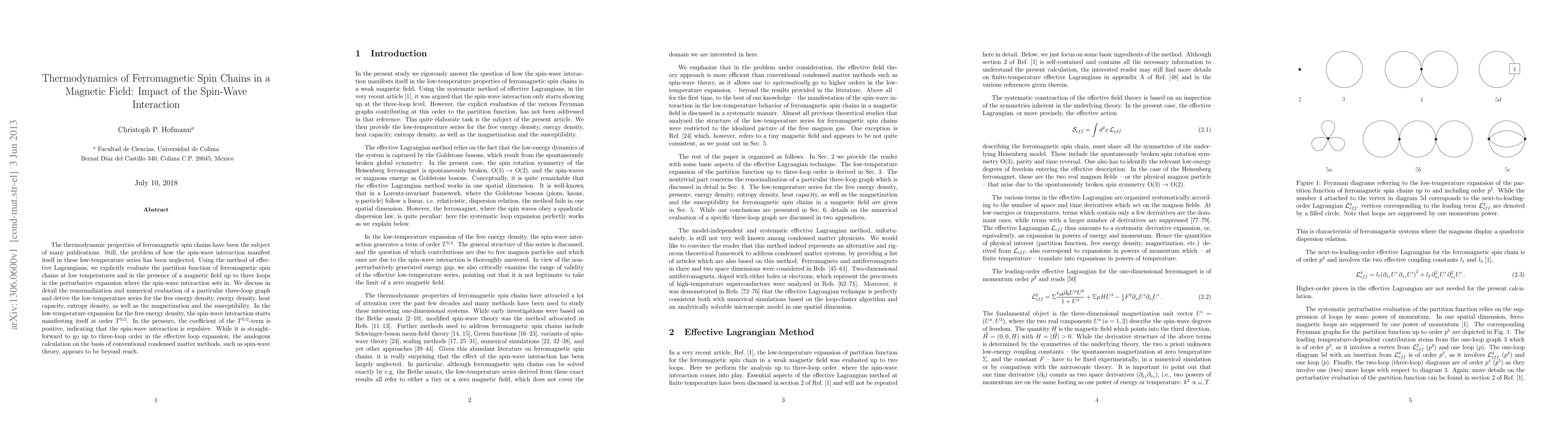This paper evaluates the thermodynamic properties of ferromagnetic spin chains under a magnetic field, focusing on the impact of spin-wave interactions. It uses effective Lagrangians to derive low-temperature series for various thermodynamic quantities, revealing that spin-wave interactions become significant at $T^{5/2}$ and are repulsive.