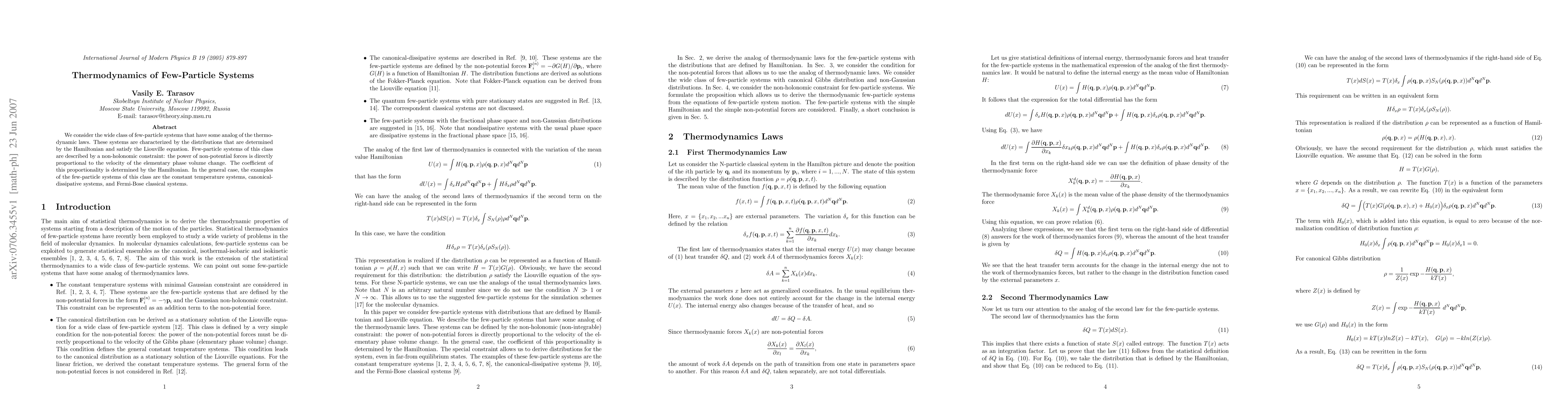 We consider the wide class of few-particle systems that have some analog of the thermodynamic laws. These systems are characterized by the distributions that are determined by the Hamiltonian and satisfy the Liouville equation. Few-particle systems of this class are described by a non-holonomic constraint: the power of non-potential forces is directly proportional to the velocity of the elementary phase volume change. The coefficient of this proportionality is determined by the Hamiltonian. In the general case, the examples of the few-particle systems of this class are the constant temperature systems, canonical-dissipative systems, and Fermi-Bose classical systems.