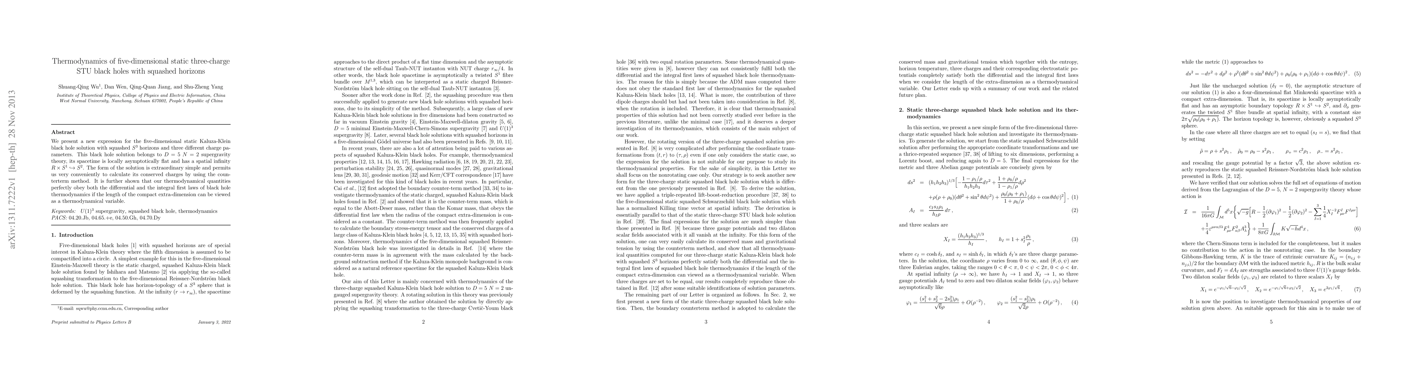 We present a new expression for the five-dimensional static Kaluza-Klein black hole solution with squashed $S^3$ horizons and three different charge parameters. This black hole solution belongs to $D = 5$ $N = 2$ supergravity theory, its spacetime is locally asymptotically flat and has a spatial infinity $R \times S^1 \hookrightarrow S^2$. The form of the solution is extraordinary simple and permits us very conveniently to calculate its conserved charges by using the counterterm method. It is further shown that our thermodynamical quantities perfectly obey both the differential and the integral first laws of black hole thermodynamics if the length of the compact extra-dimension can be viewed as a thermodynamical variable.